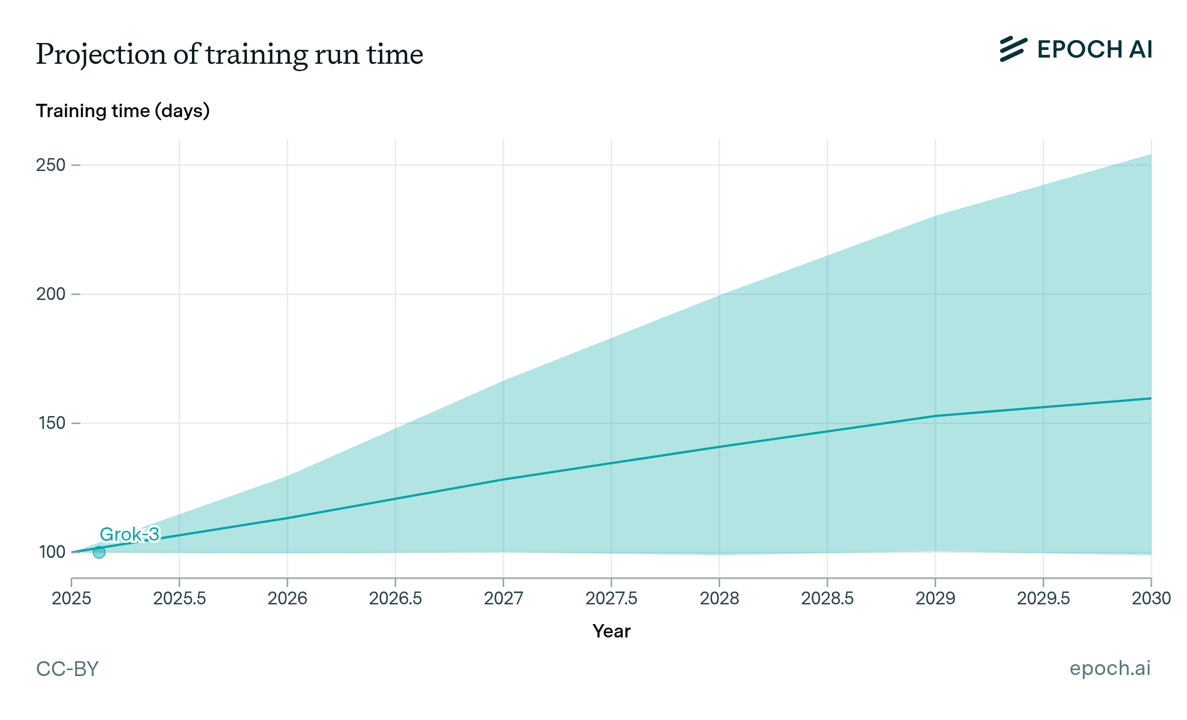Our projection uses 100 days as a starting point based on recent data points like Grok-3 and GPT-4. The 10th-percentile projection assumes that frontier training runs stay at this duration, due to competitive pressure to release better models frequently. The 90th-percentile projection assumes initial growth of 31% per year based on the 90th percentile of the historical trend, before plateauing to about 9 months after 2030. This plateau of 9 months is an estimated upper bound assuming that AI developers optimise the timing of training runs for performance per dollar. The median trajectory is calculated assuming a log-normal distribution with these percentiles, initially growing at about 13% per year.