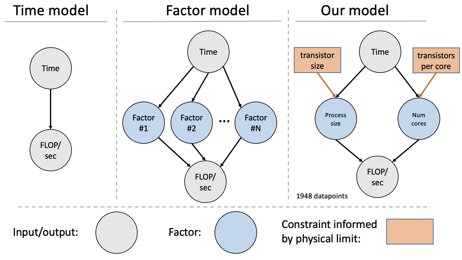 Figure 2: Overview of different approaches to modeling GPU performance. In this piece, we choose a factor model with two variables (process size and number of cores) and include the limits of miniaturization.