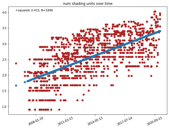 Since we ultimately want to make predictions far into the future, every variable has to correlate with time consistently, e.g., later dates consistently imply an increase in log10(num_cores). We operationalize this by building a linear model log(feature) ~ time and excluding every variable with an r-squared value of less than 0.3. Using a log-linear model also ensures that the variation of the feature is over time and not over the feature. In the following figure, you can see an example of how the number of shading units changes over time.
