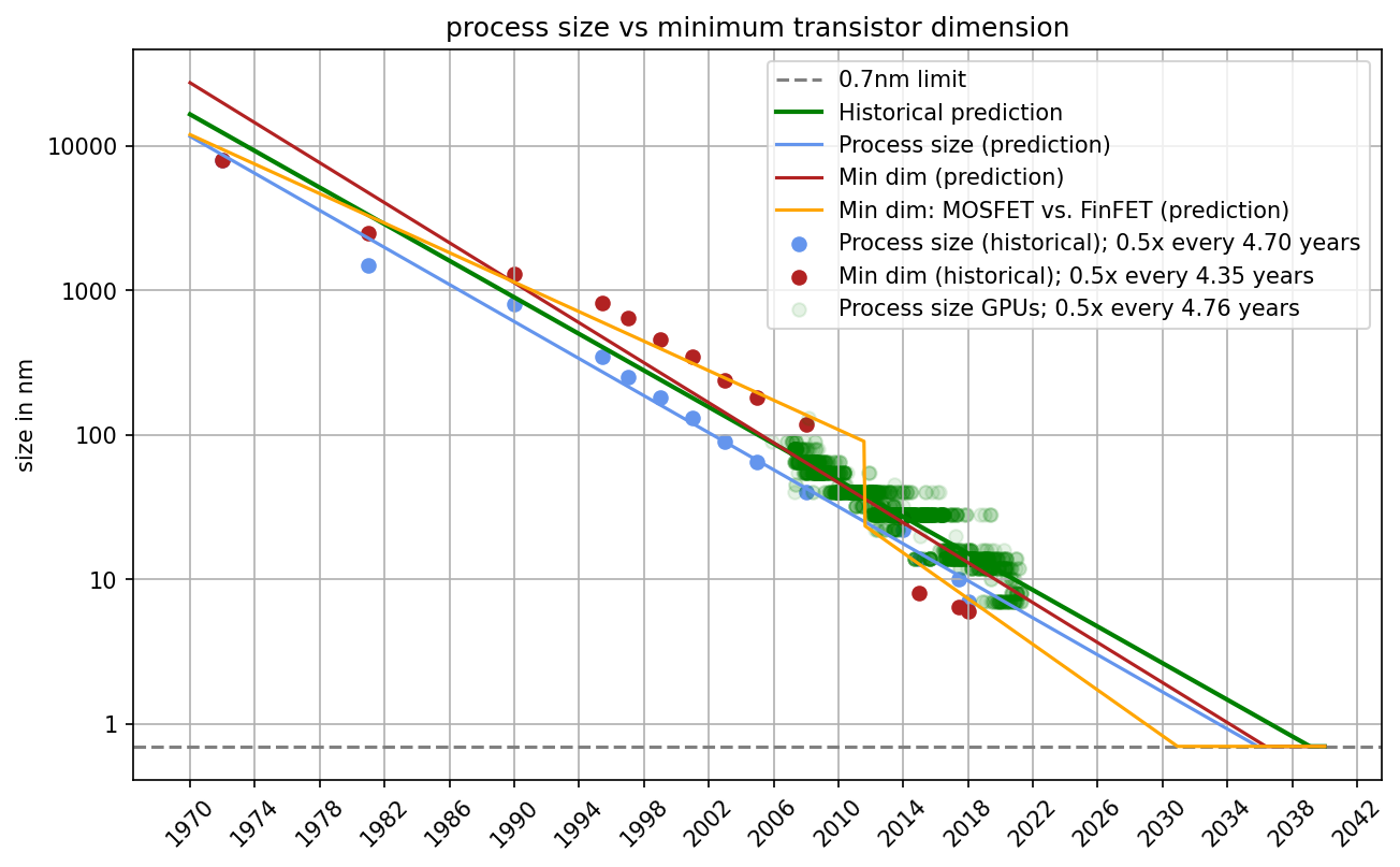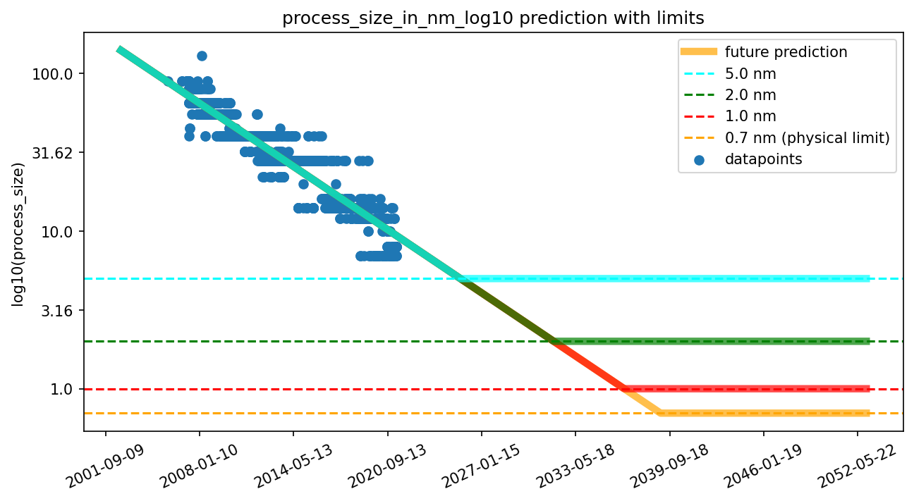 Figure 9: Projections from historical process size (as a proxy for transistor size) with different physical size limits.