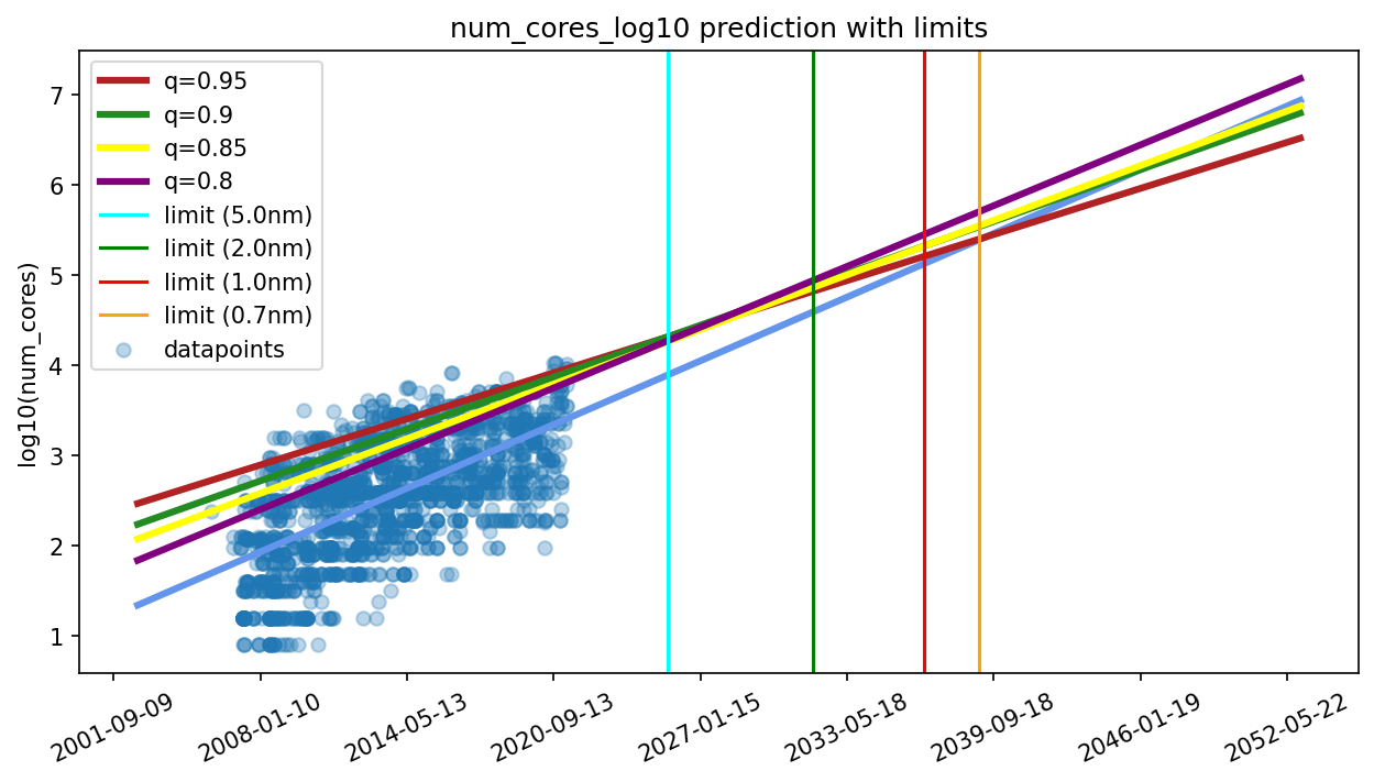 In practice, that means we project the future trajectory of process size from the historical trend and fix the date at which the limit is hit. All values after that date will be set to the limit, i.e., progress in transistor miniaturization is assumed to stop at that point.