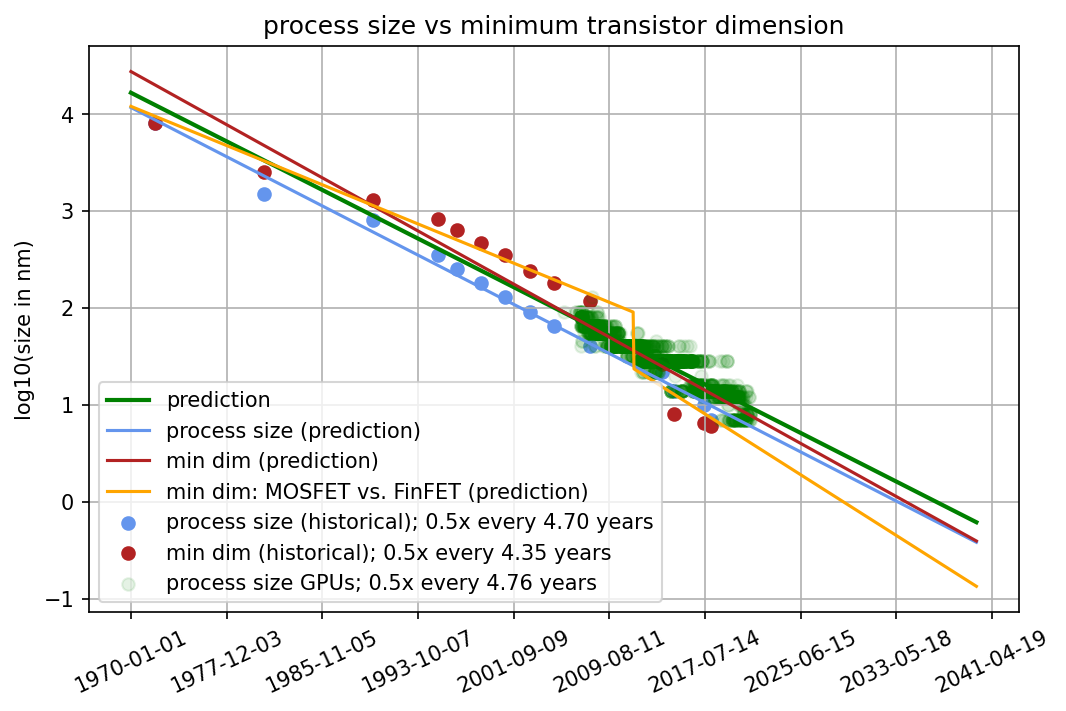 We found that, historically, process size and the minimum dimension of the transistor very strongly correlate and, therefore, extrapolating either produces very similar predictions (see Figure 4 and Appendix D). We chose to keep process size as the predictive factor for two reasons. First, we think it’s not clear that the minimal dimension of a transistor is a better measurement than process size. Just because the smaller dimension has hit its limit does not mean the larger dimension has. Second, we have very few data points for FinFET-based GPUs. Thus, predictions based on them might be misleading or inaccurate. For the rest of the report, you can thus think of “process size” as an approximation to transistor size.
