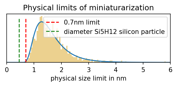 To include our uncertainty about the boundary, we sample from a log-normal distribution over possible values of the limit as indicated in the following figure. We chose the parameters of the distribution such that the limit is below current capabilities but above the suggested physical limit. Interestingly, this distribution also aligns with the projected limit of quantum tunneling at 1-3nm.