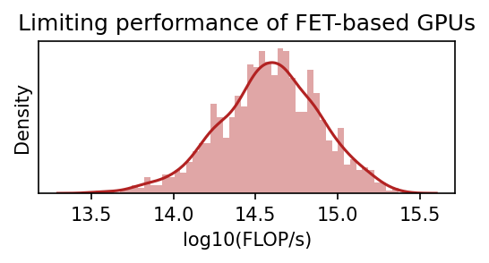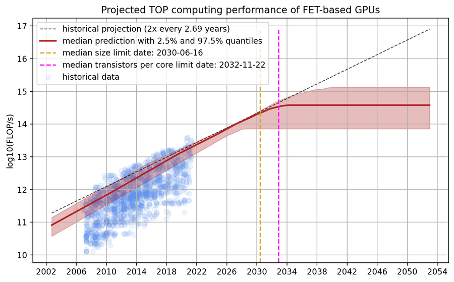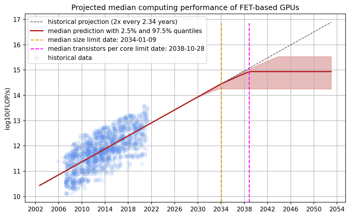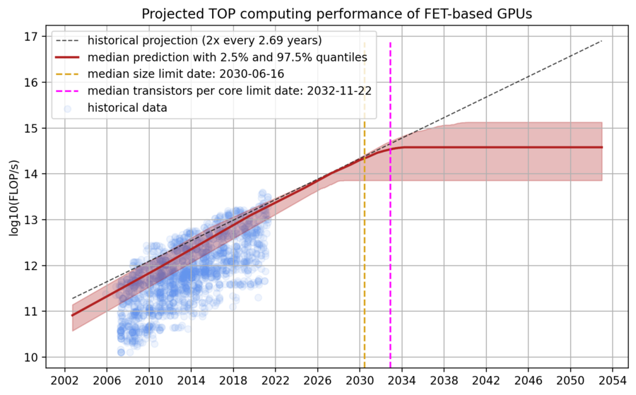 Our model predicts that the median dates for the two limits are 2030 and 2033. Furthermore, the model predicts that the performance limit is hit between 2027 and 2035 with a maximum performance of 1e14 and 1e15 FLOP/s. If we assume constant prices and an amortization period of three years, this would mean that the price per FLOP for the limiting GPUs based on field-effect transistors is between 1e22 FLOP/$ and 1e23 FLOP/$.3
