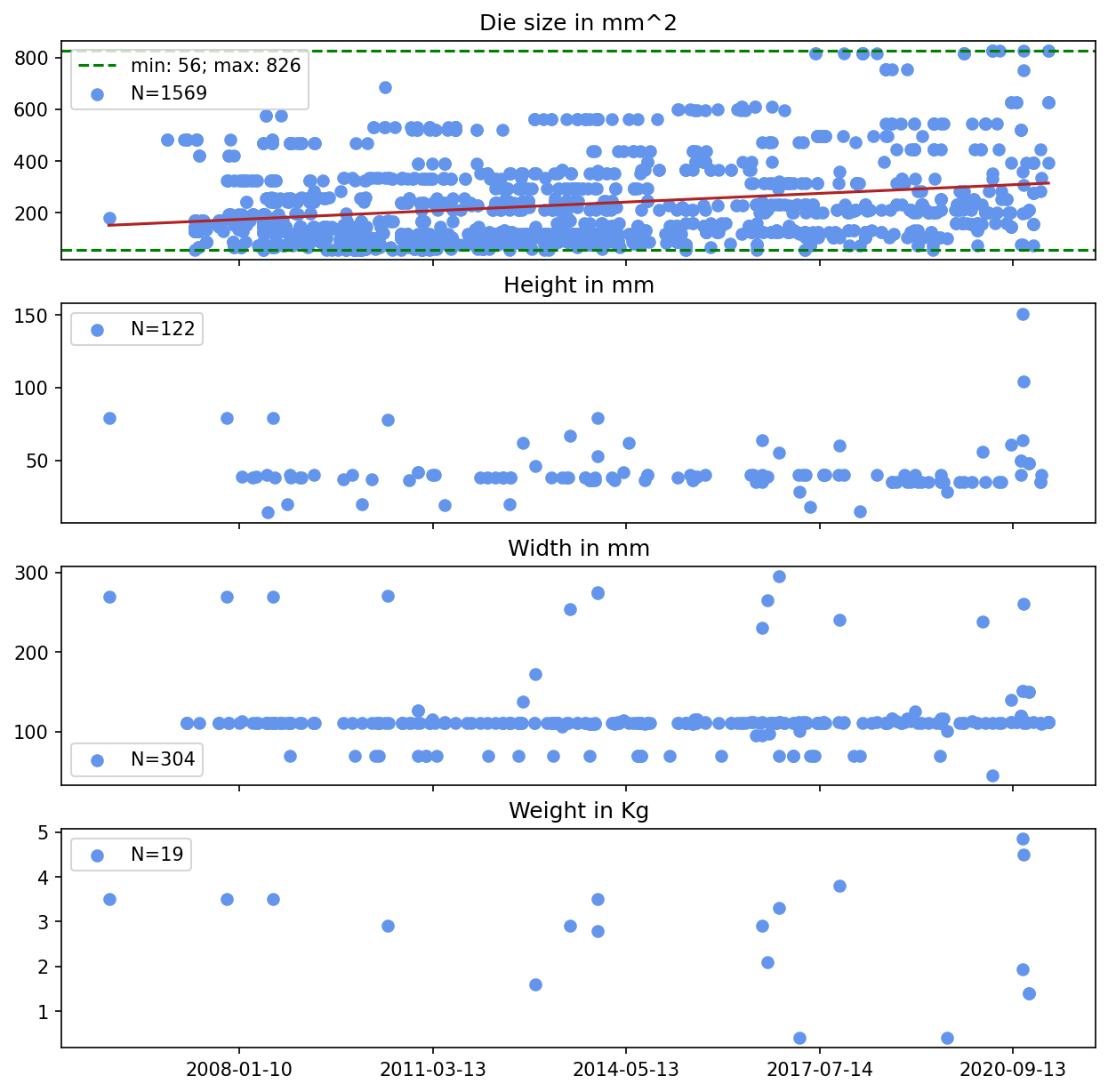 Let’s first establish some facts about the growth of different sizes in GPUs. In the following figure, we can see that the average die size increased over time and the upper limit got higher. Furthermore, height and width of the median GPU stayed the same but the maximum increased. For weight, we can see that the variance increased but the average stayed roughly the same. However, height, width and weight are only available for a small subset of the GPUs, so we should be cautious about all interpretations.