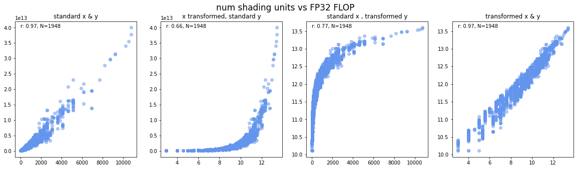 Figure 7: Correlations of features with performance (in FLOP/s) for different transformations of the data. In the example of the number of shading units, log transformations of both variables seem to give the best fit.