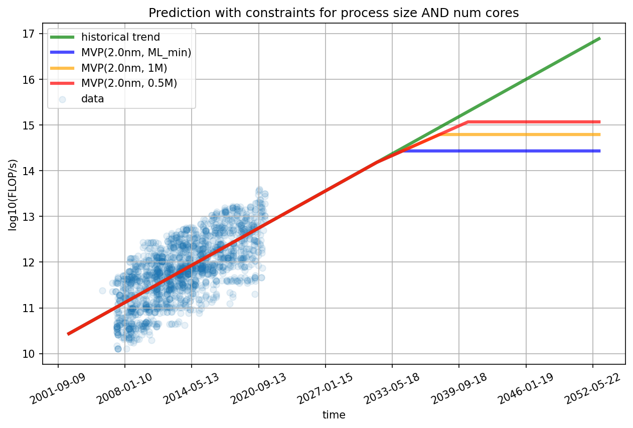Figure 13: Examples of projections with different constraints. All trajectories assume a miniaturization limit of 2nm and a transistors-per-core limit of 2.6M (ML_min), 1M and 0.5M respectively. The main purpose of this figure is to show the two kinks that correspond to the two limits being hit.