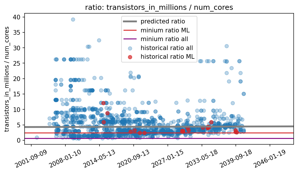 We enforce a prior over the number of transistors per core that is informed by our dataset (see Figure 5). Specifically, we find that the minimum number of transistors per core has been 600k, while this minimum ratio of GPUs used in ML (where workloads are generally highly parallel) is on the order of 2.4M.2