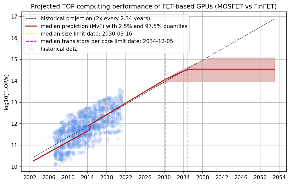 Lastly, we test if the distinction between MOSFET and FinFET transistors makes a difference for the compute projections. Concretely, one might suggest that FinFET miniaturization has been slightly faster than MOSFET miniaturization, and thus, the limit would be hit earlier.