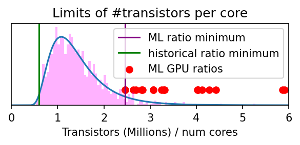 Figure 12: With the information from the previous figure, we construct a distribution that reflects our best guess of what the limit of the number of transistors per core is. We think it is likely lower than what current state-of-the-art ML GPUs can achieve (since they are likely not optimized for that ratio) but a bit higher than the historical minimum.