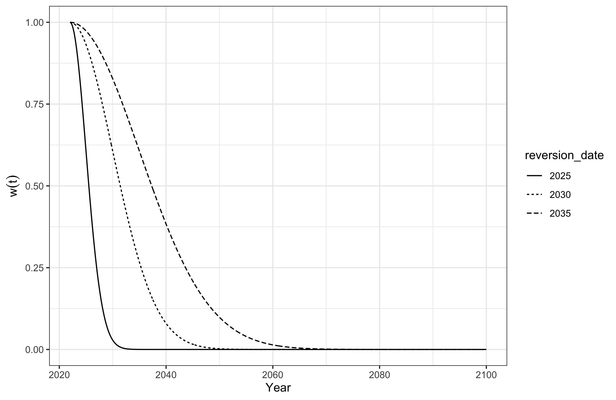 \[\begin{equation} w(t) = \exp\bigg(\frac{(t-2022)^2}{2(\text{reversion date}-2022)^2}\bigg)^{-1}. \end{equation}\]