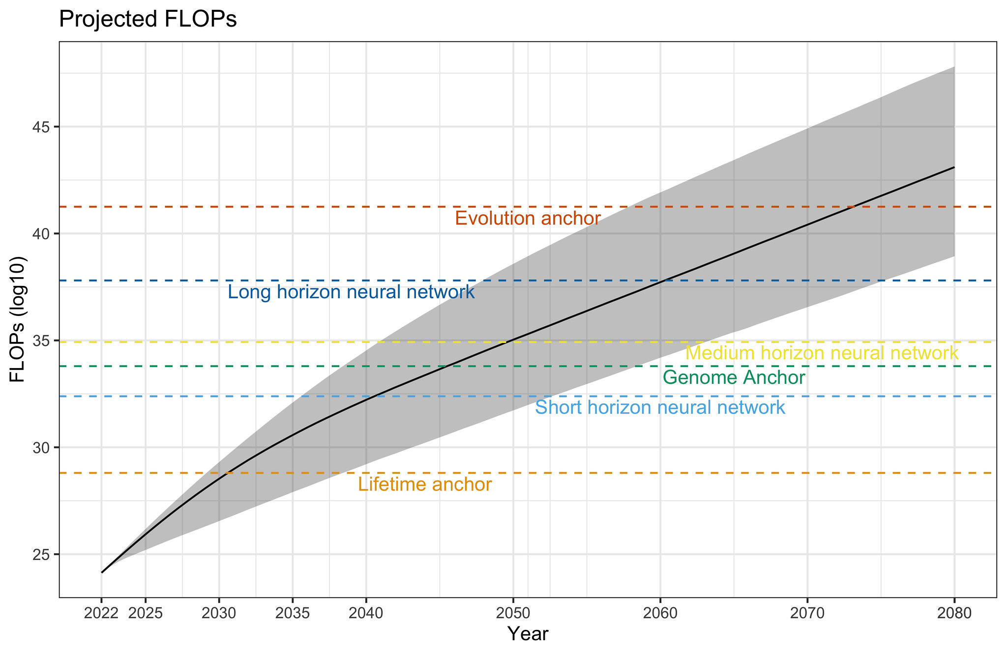 Projecting forward 70 years' worth of trends in the amount of compute used to train machine learning models.