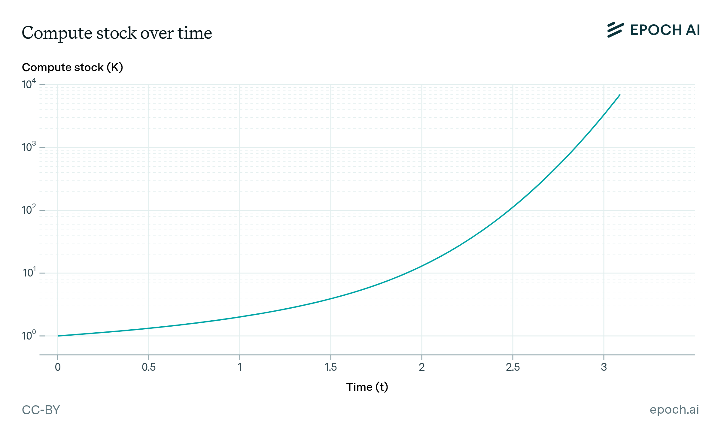 Figure 1. Plot of the compute stock \(K\) over time for \(q = \frac{1}{2}\), \(c = 1\), and initial conditions \(T(0) = K(0) = 1\). Note the log scale on the vertical axis: exponential growth would be a straight line, so \(K\) is growing super-exponentially as expected.