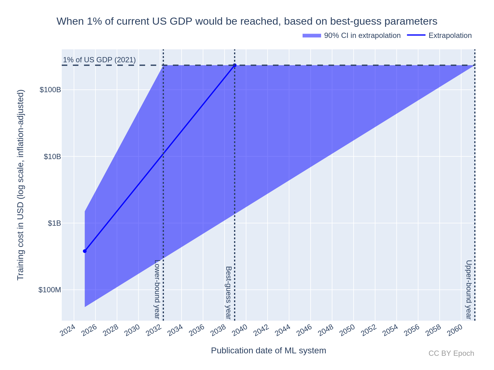 - By contrast, my best-guess forecast adjusted for evidence that the growth in costs will slow down in the future, and for sources of bias in the cost estimates.11 These adjustments partly relied on my intuition-based judgements, so the result should be interpreted with caution. I extrapolated from the year 2025 with an initial cost of $380M (90% CI: $55M to $1.5B) using a growth rate of 0.2 OOMs/year (90% CI: 0.1 to 0.3 OOMs/year), to find that the cost of compute for the most expensive training run would exceed a real value of $233B in the year 2040 (90% CI: 2033 to 2062).