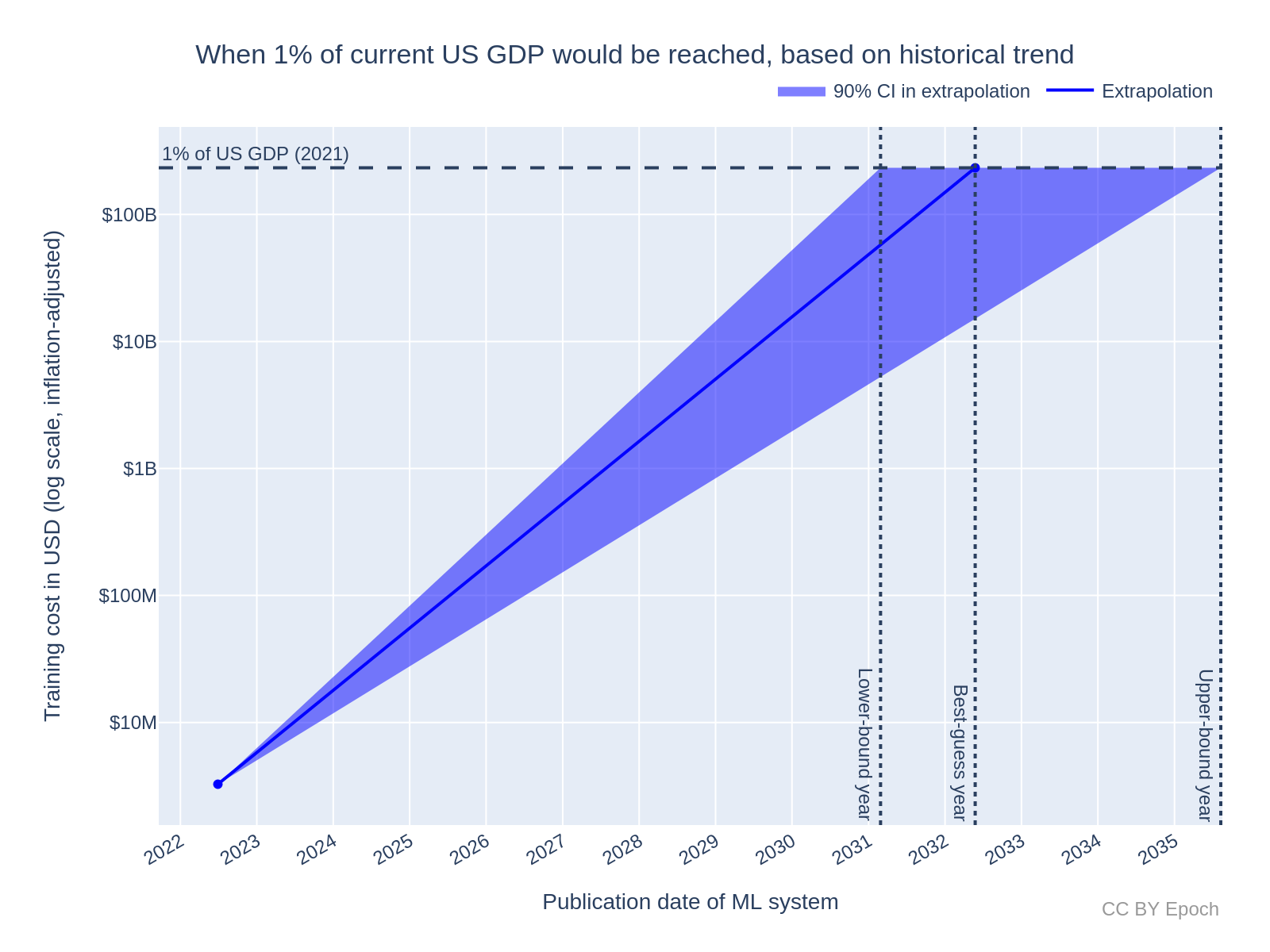 - Naively extrapolating from the current most expensive cost estimate (Minerva at $3.27M) using the "all systems" growth rate of 0.49 OOMs/year (90% CI: 0.37 to 0.56), the cost of compute for the most expensive training run would exceed a real value of $233B in the year 2032 (90% CI: 2031 to 2036).