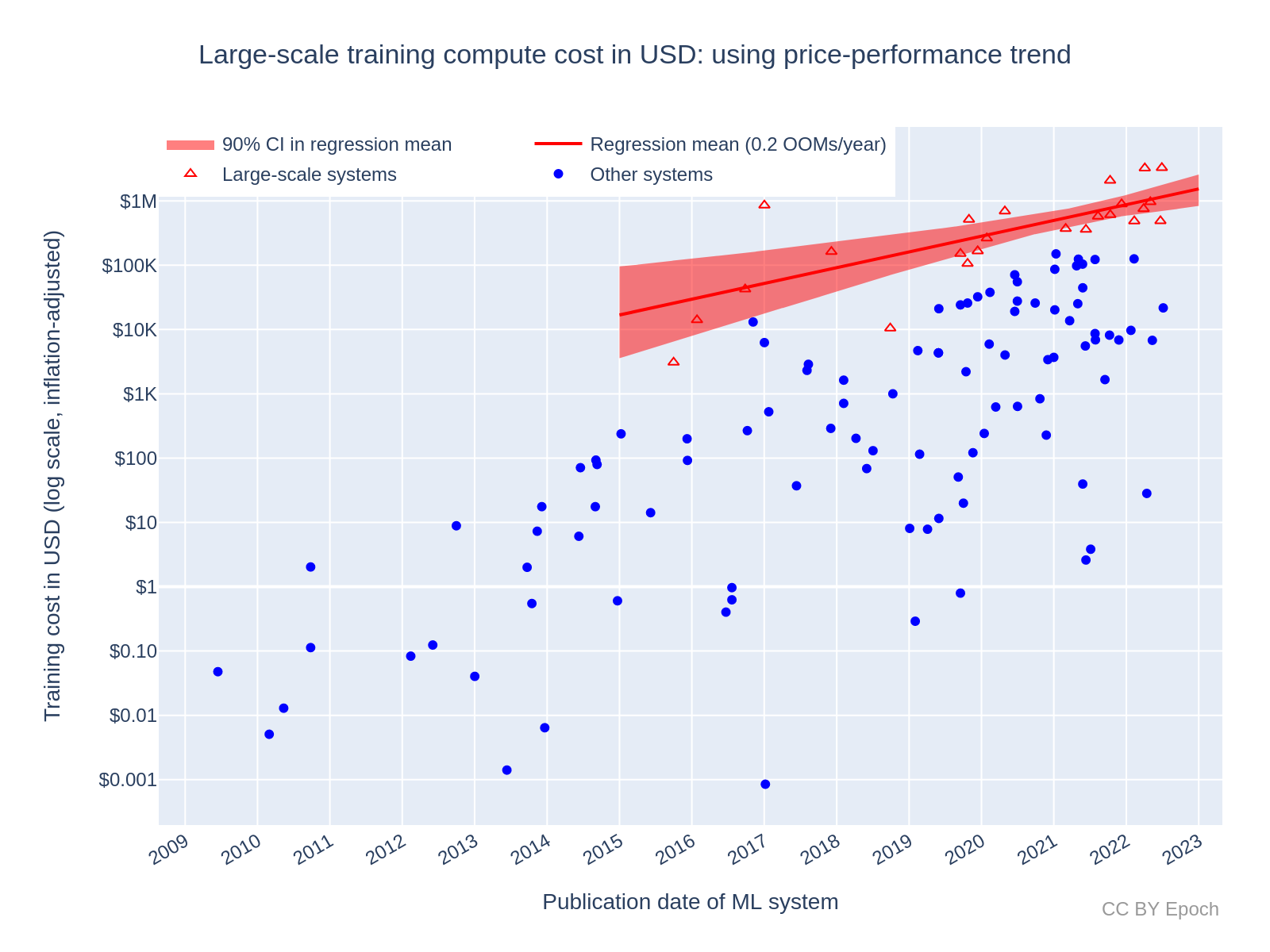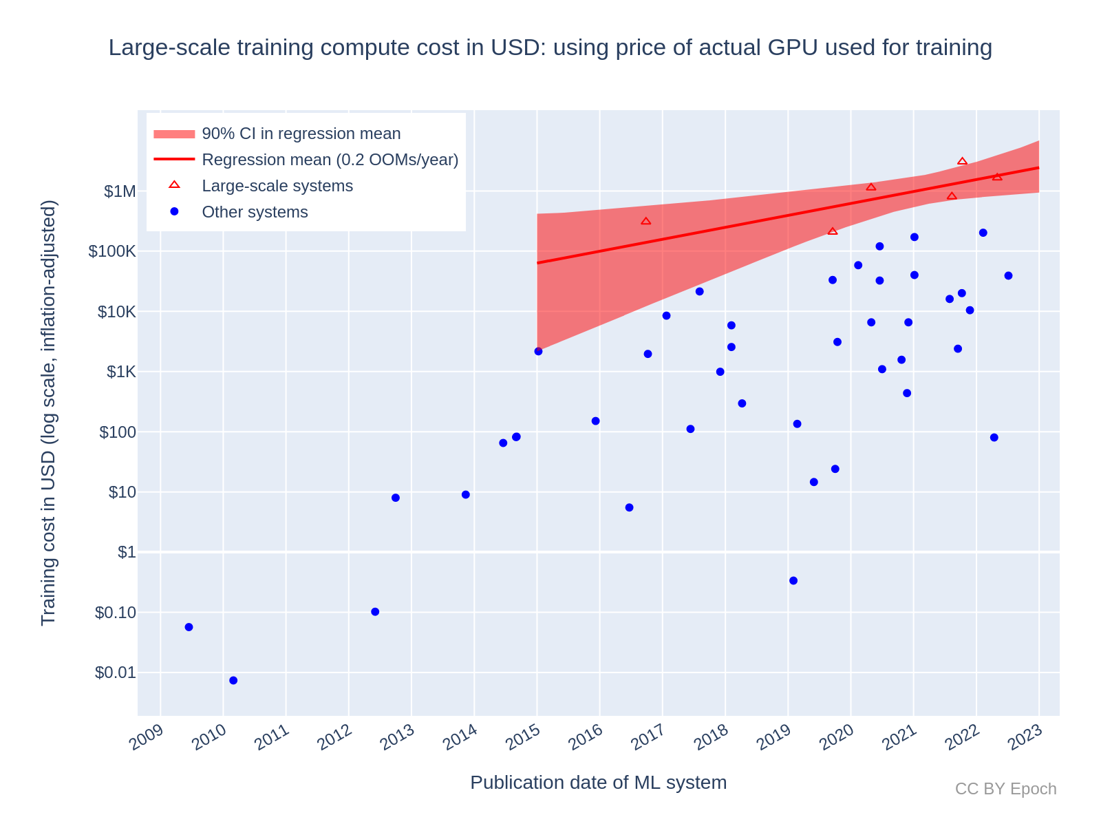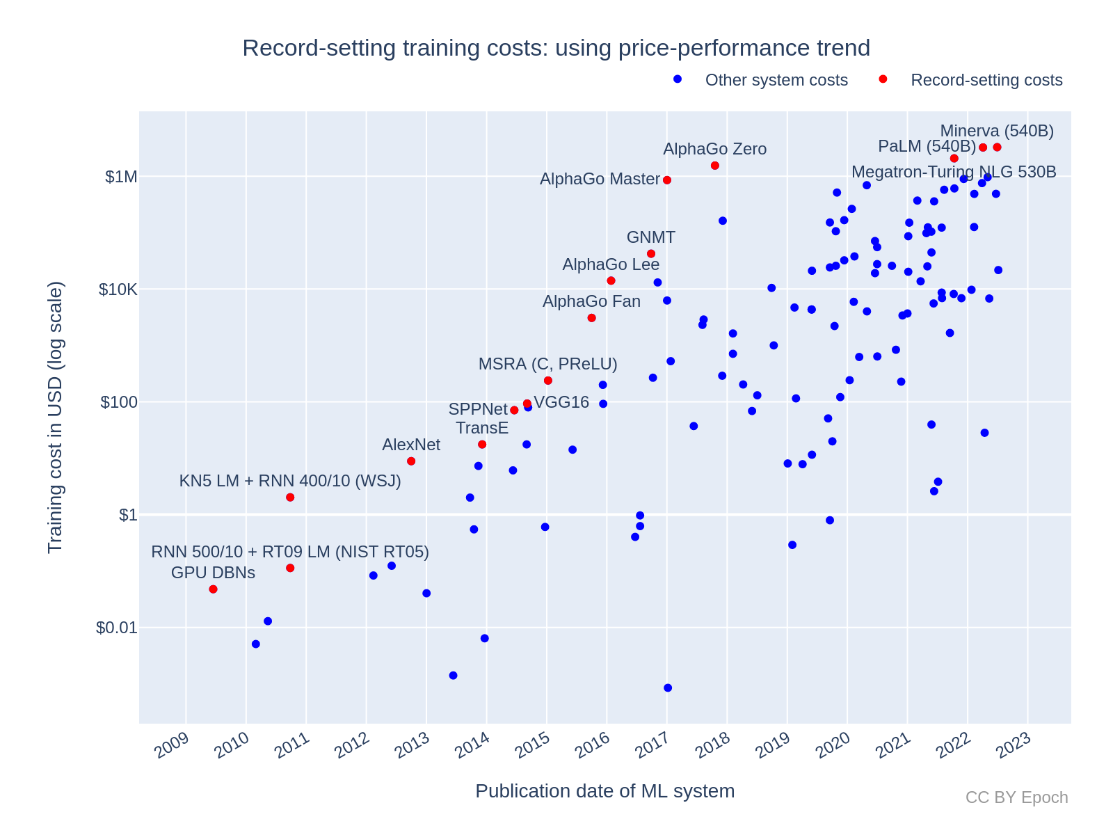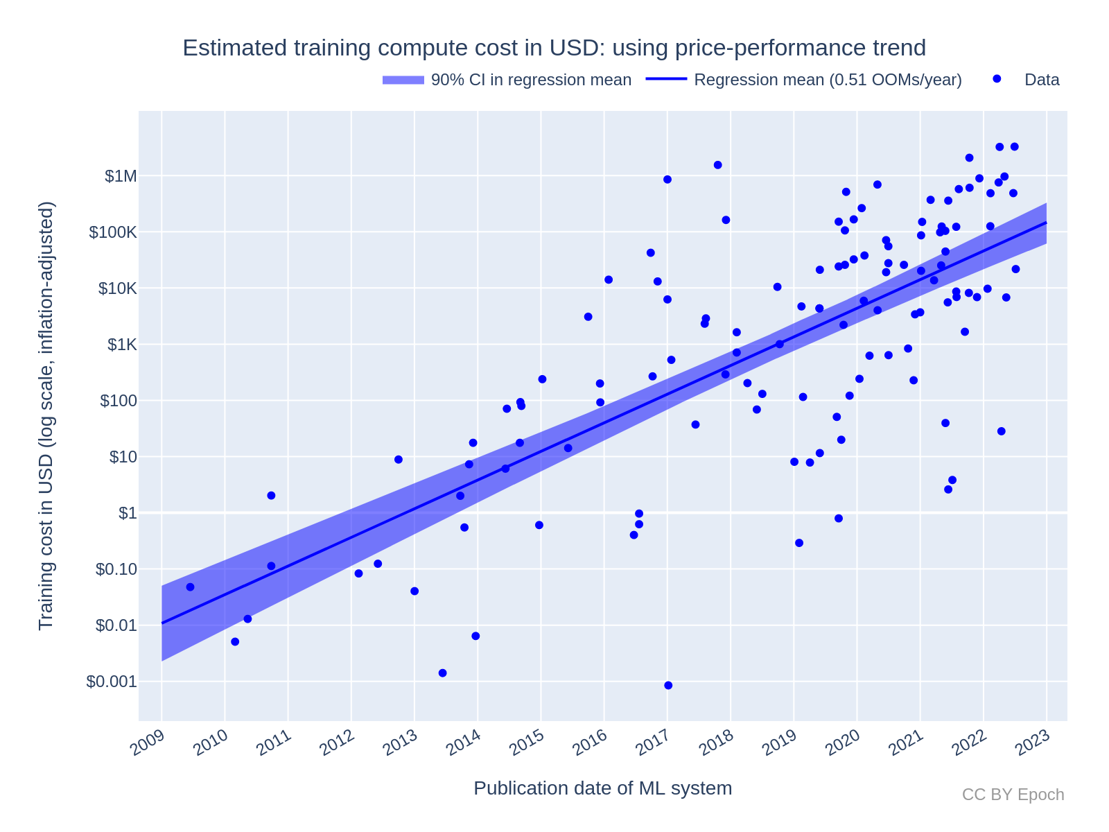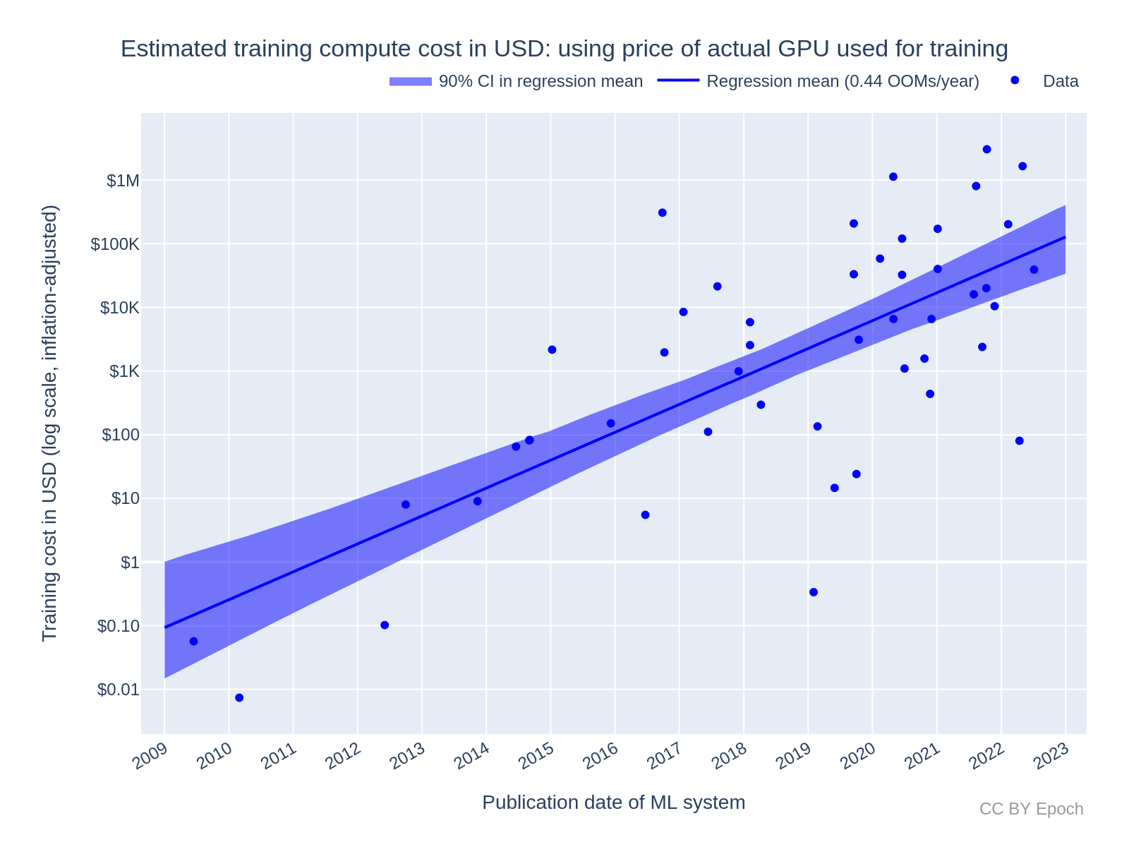 Figure 1: estimated cost of compute in US dollars for the final training run of ML systems. The costs here are estimated based on the trend in price-performance for all GPUs in Hobbhahn & Besiroglu (2022) (known as “Method 1” in this report).