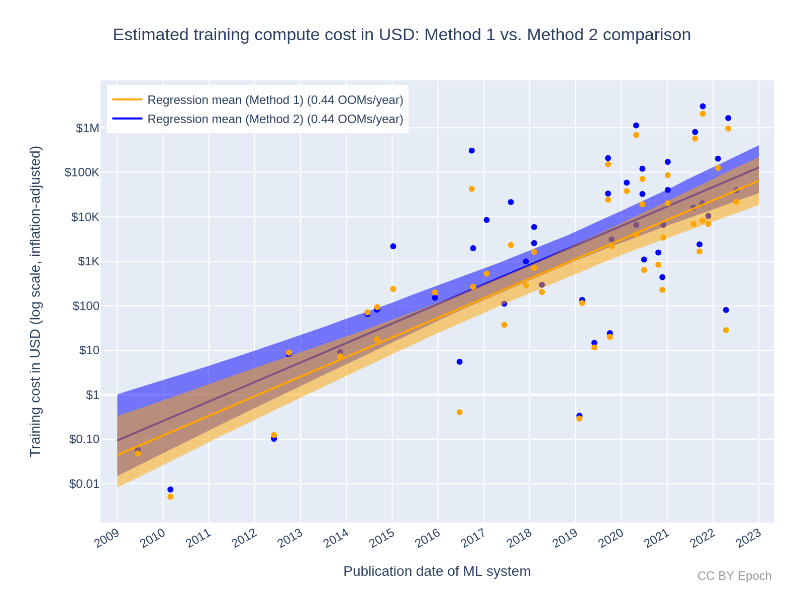 Using a dataset of 124 machine learning (ML) systems published between 2009 and 2022,1 I estimate that the cost of compute in US dollars for the final training run of ML systems has grown by 0.49 orders of magnitude (OOM) per year (90% CI: 0.37 to 0.56).2 See Table 1 for more detailed results, indicated by “All systems.”3