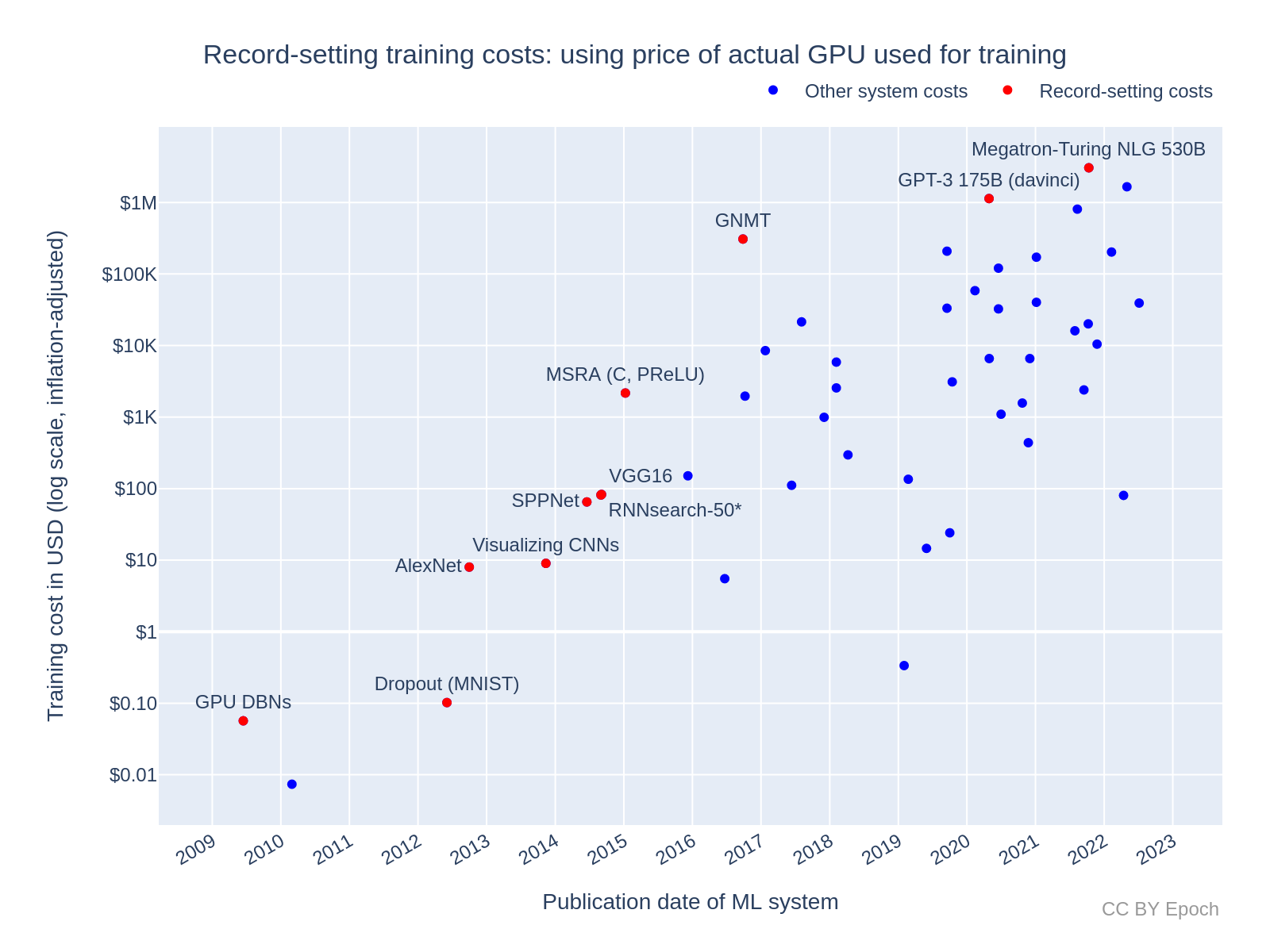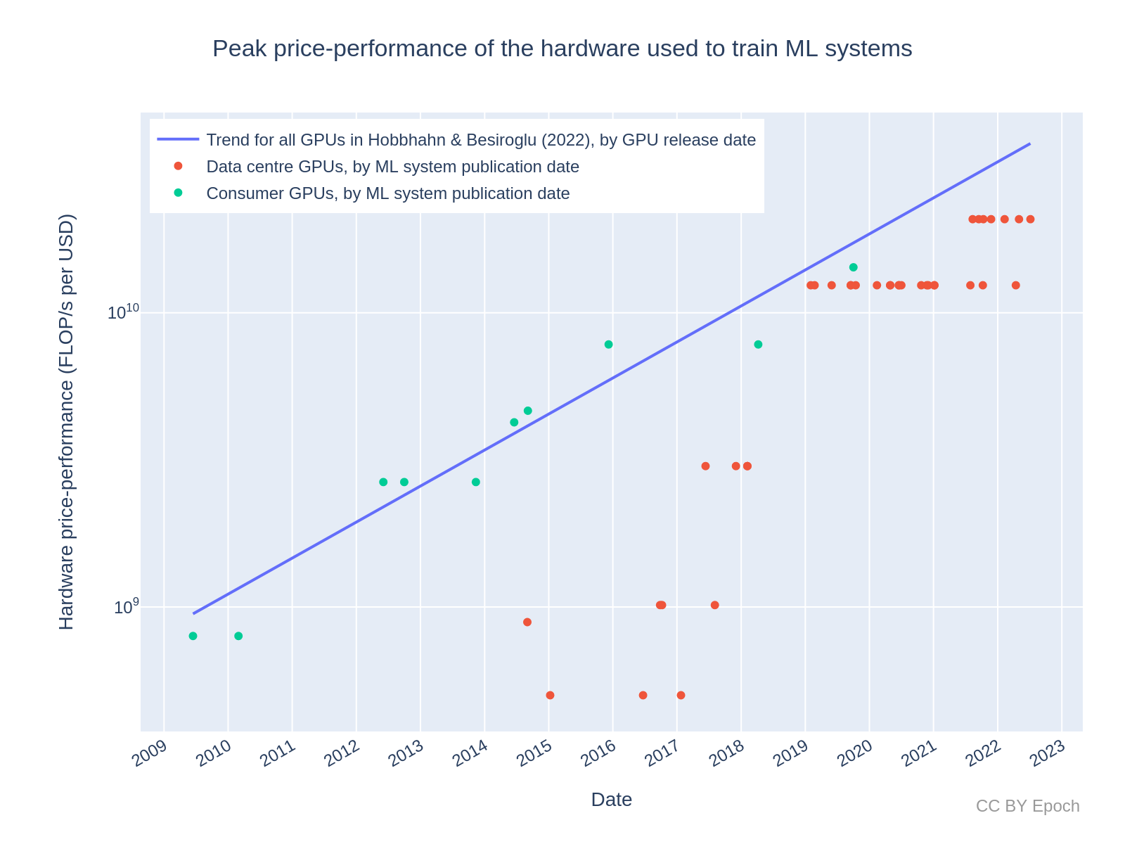 | (2) Using the peak price-performance of the actual NVIDIA GPUs used to train ML systems (go to results) | All systems (n=48) | Jun 2009– Jul 2022 |