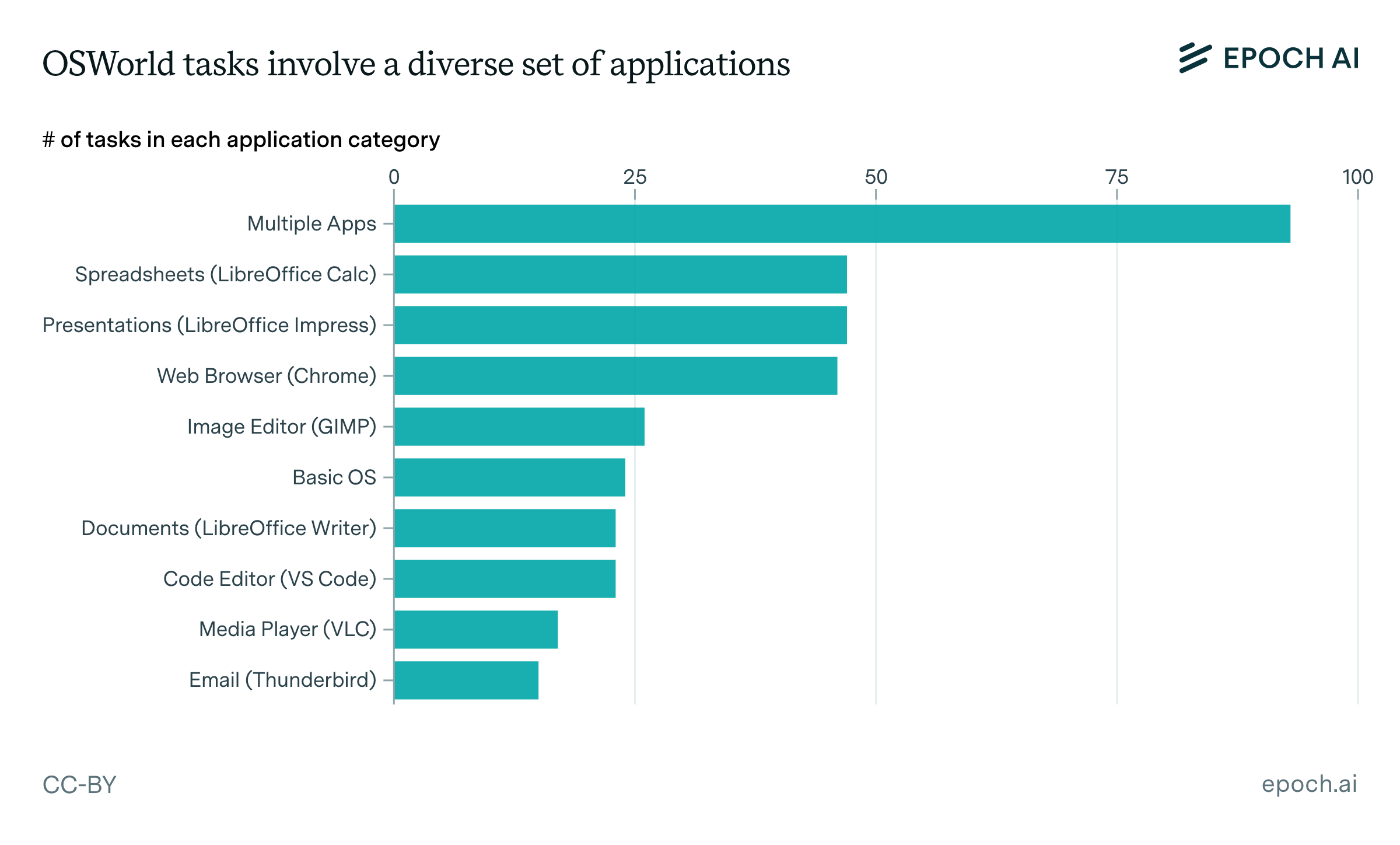 OSWorld helps tell us how good an AI system is at executing simple, realistic tasks in Linux-based environments using popular open-source applications. State-of-the-art models have come a long way on the benchmark, from less than 10% to almost 70%. It is fair to say that much of this reflects improved computer-use capabilities.
