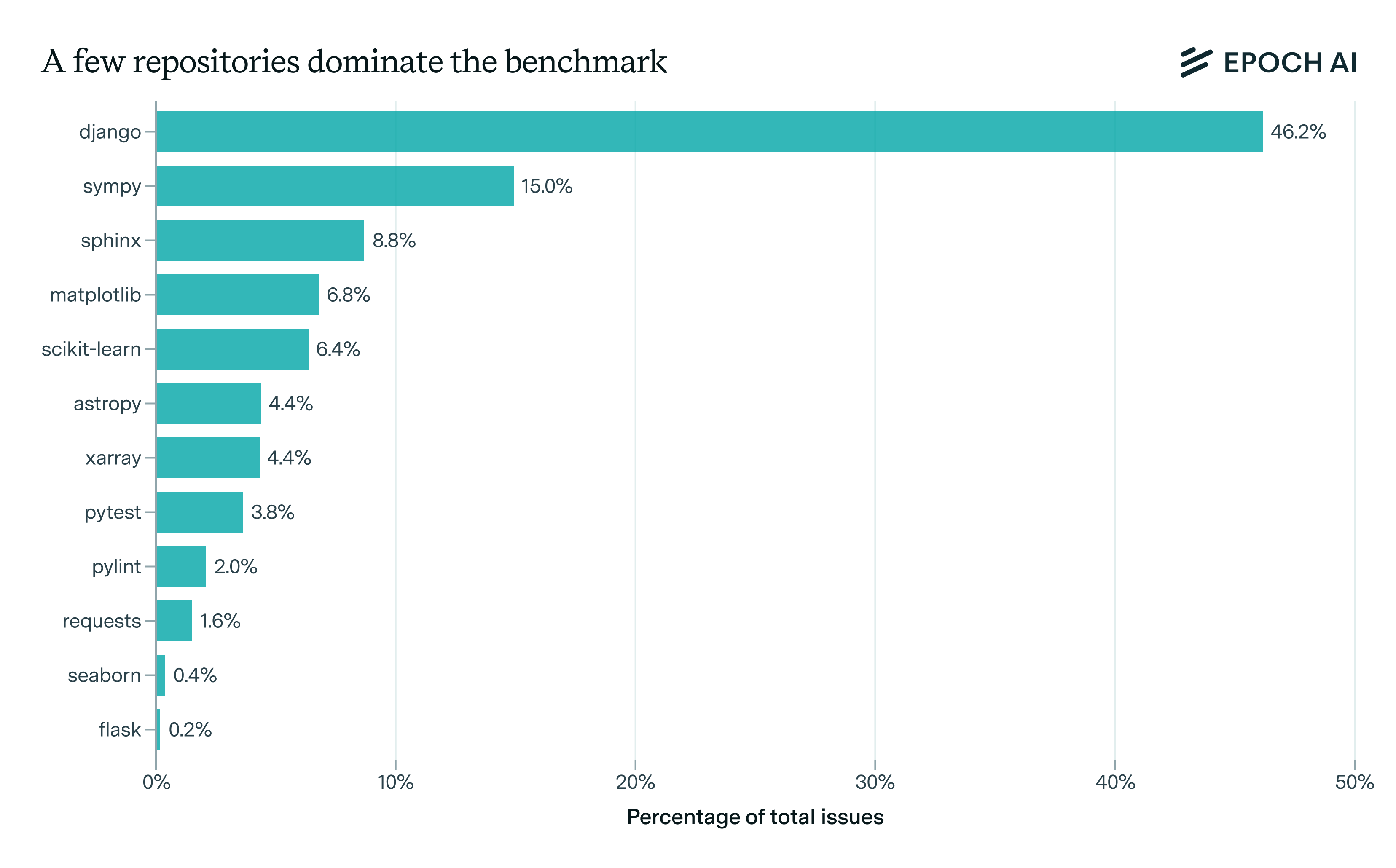 Aside from the low diversity, the distribution of those repositories is heavily skewed. One repository, the web framework Django, comprises nearly half of all issues. The five largest repositories (django, sympy, sphinx, matplotlib, scikit-learn) account for over 80% of the benchmark, whereas the five smallest repositories represent only about 8% of the total.