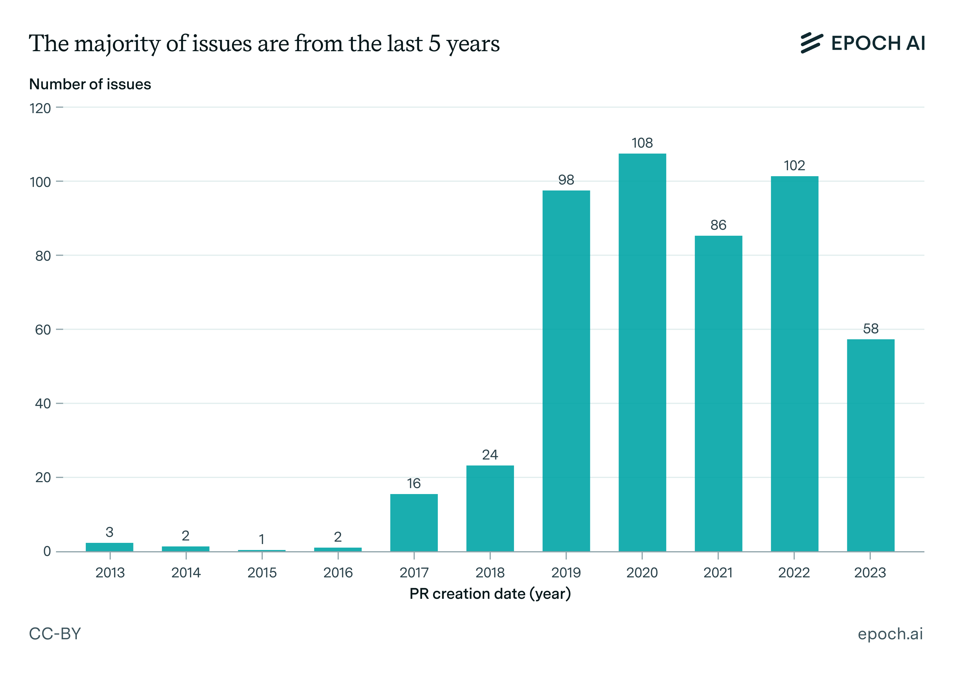 Half of the issues in SWE-bench Verified are from 2020 or earlier, with some dating back as far as 12 years. To put this into perspective, Python 3.9, released in 2020, will be declared End of Life (EOL) in October 2025. Consequently, the benchmark often asks models to work in codebases with Python features that will soon be phased out.