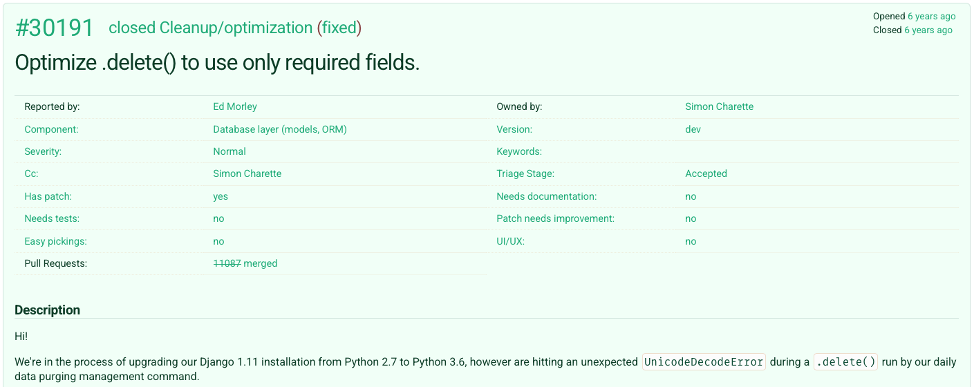 The issue from the screenshot, which can be found here, is about the migrating Django projects between versions when switching from Python 2 to 3 and was created in 2019, a few months before the EOL date. We found a few similar issues and found that the code that fixed those bugs uses Python features that still work today. While dealing with legacy codebases is indeed part of real-world software engineering, with enterprises being slow to update their software and use it beyond EOL, Python users in general are quick to adopt new Python versions, with features such as type hinting becoming increasingly popular. The selection of the issue dates and repos does not capture those “modern” features.