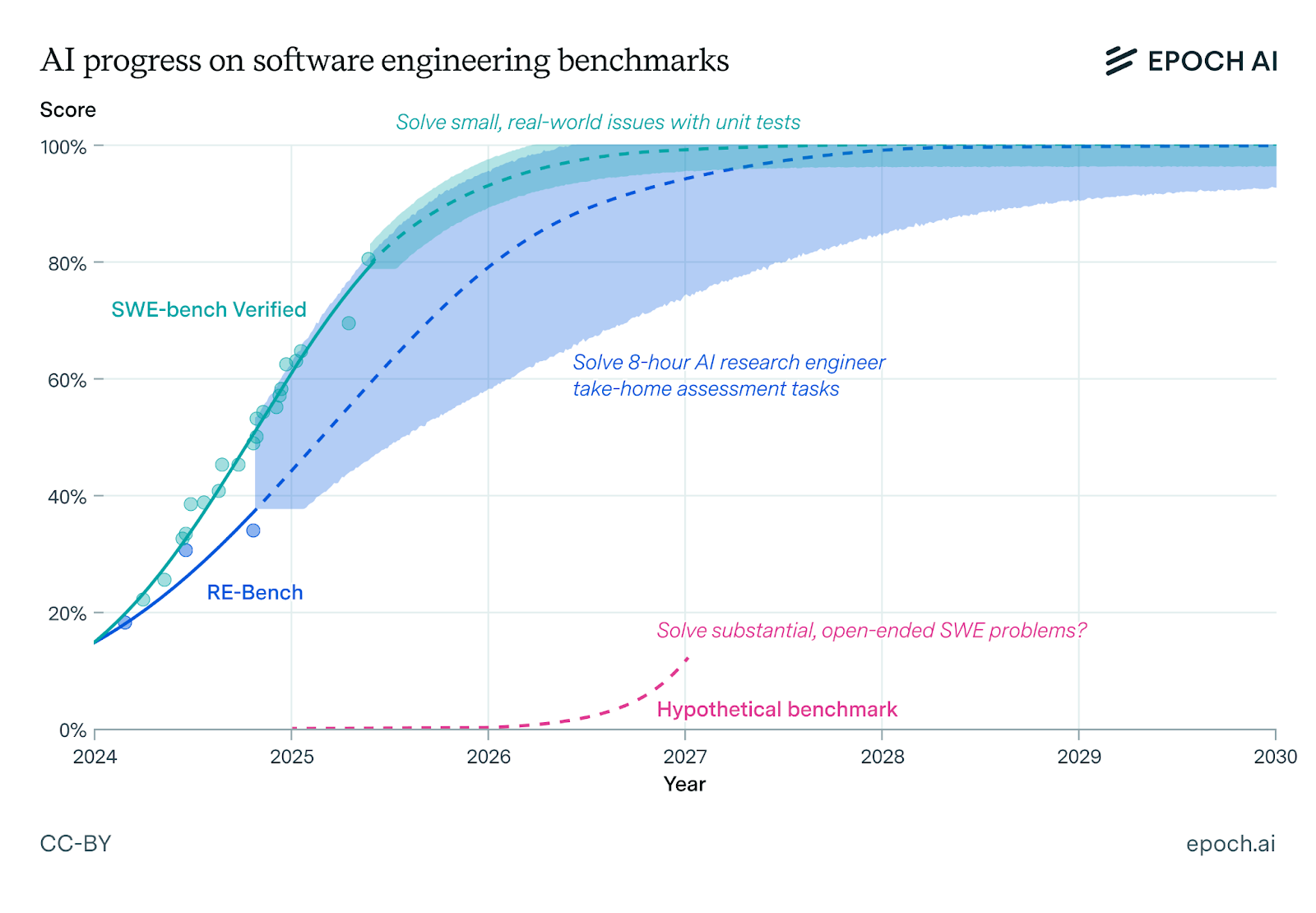 Software engineering: AI is already transforming software engineering through code assistants and question-answering. By 2030, on current trends, AI will be able to autonomously fix issues, implement features, and solve difficult (but well-defined) scientific programming problems.