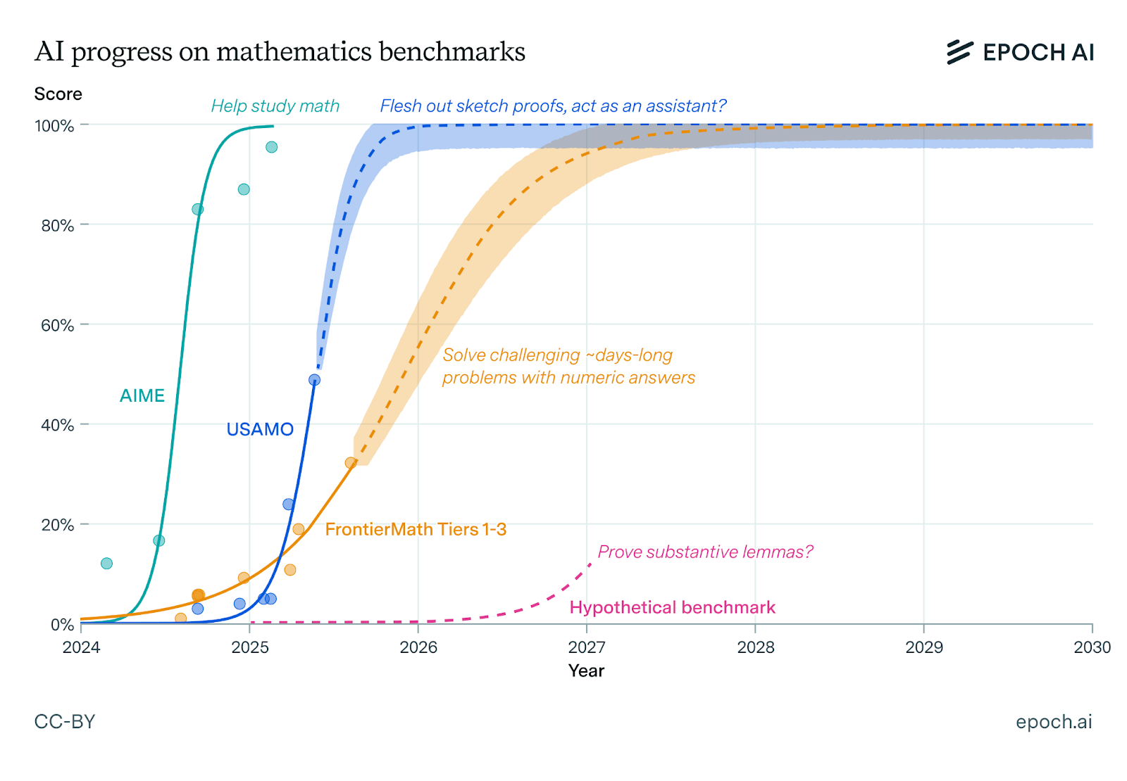 Mathematics: AI may soon act as a research assistant, fleshing out proof sketches or intuitions. Early accounts already document AI being helpful in mathematicians’ work. Notable mathematicians differ greatly in how relevant they think existing mathematical AI benchmarks are for their work, as well as in their predictions for how soon AI will be able to develop mathematical results autonomously, rather than as an assistant.