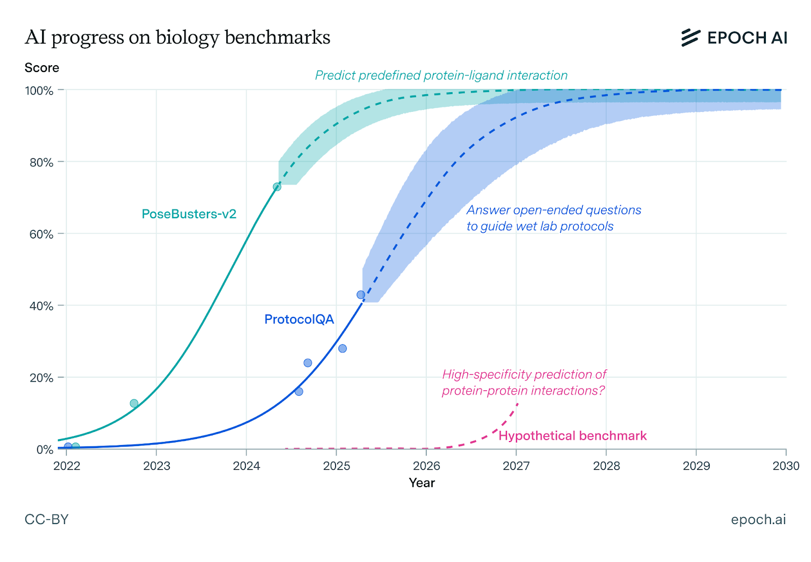 Molecular biology: Public benchmarks for protein-ligand interaction, such as PoseBusters, are on track to be solved in the next few years, although the timeline is longer (and uncertain) for prediction of arbitrary protein-protein interactions. Meanwhile, AI desk research assistants for biology R&D are coming. Existing biology protocol question-answering benchmarks should be solved by 2030. While these benchmarks don’t represent the full scope of challenges in molecular biology, their trends offer a specific window into AI’s growing capabilities in the field.