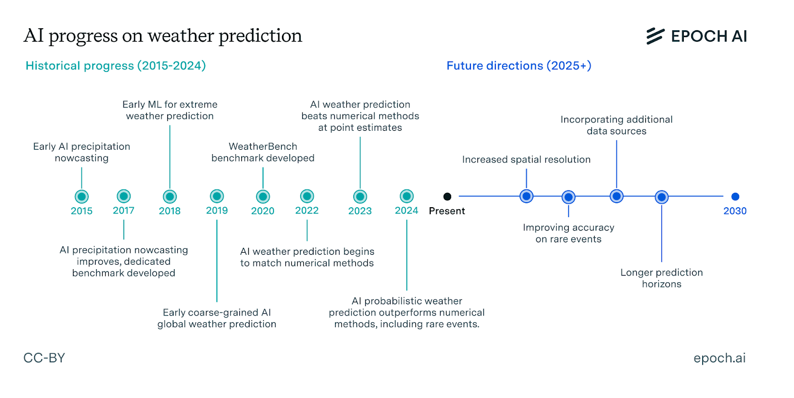 Weather prediction: AI weather prediction can already improve on traditional methods from hours up to weeks. Moreover, AI methods are cost-effective to run, and could improve further with more data. The next challenges lie in improving existing predictions, especially rare events, and making use of improved predictions to achieve benefits in the wider world.