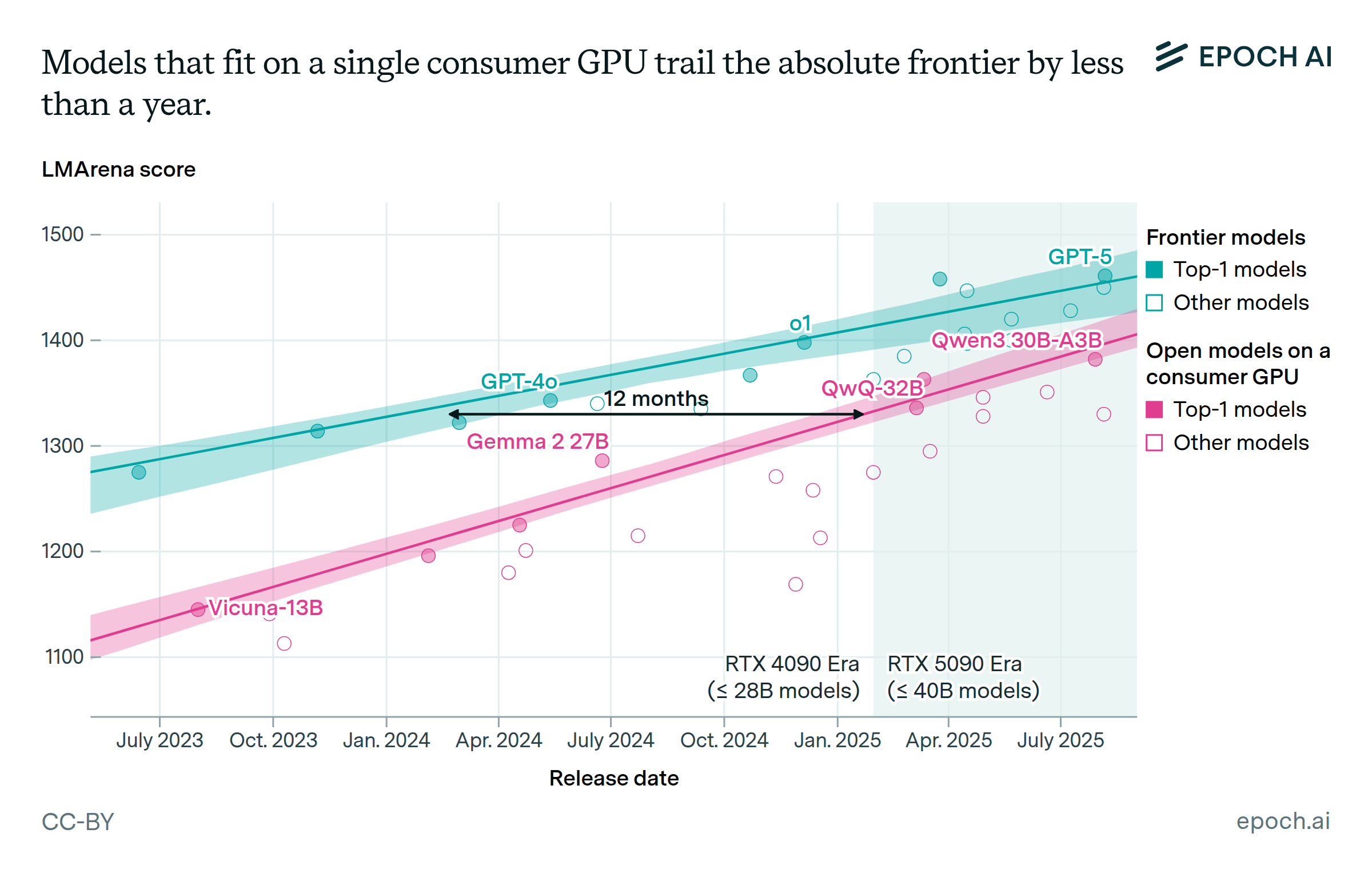 Using a single top-of-the-line gaming GPU like NVIDIA’s RTX 5090 (under $2500), anyone can locally run models matching the absolute frontier of LLM performance from just 6 to 12 months ago. This lag is consistent with our previous estimate of a 5 to 22 month gap for open-weight models of any size. However, it should be noted that small open models are more likely to be optimized for specific benchmarks, so the “real-world” lag may be somewhat longer.