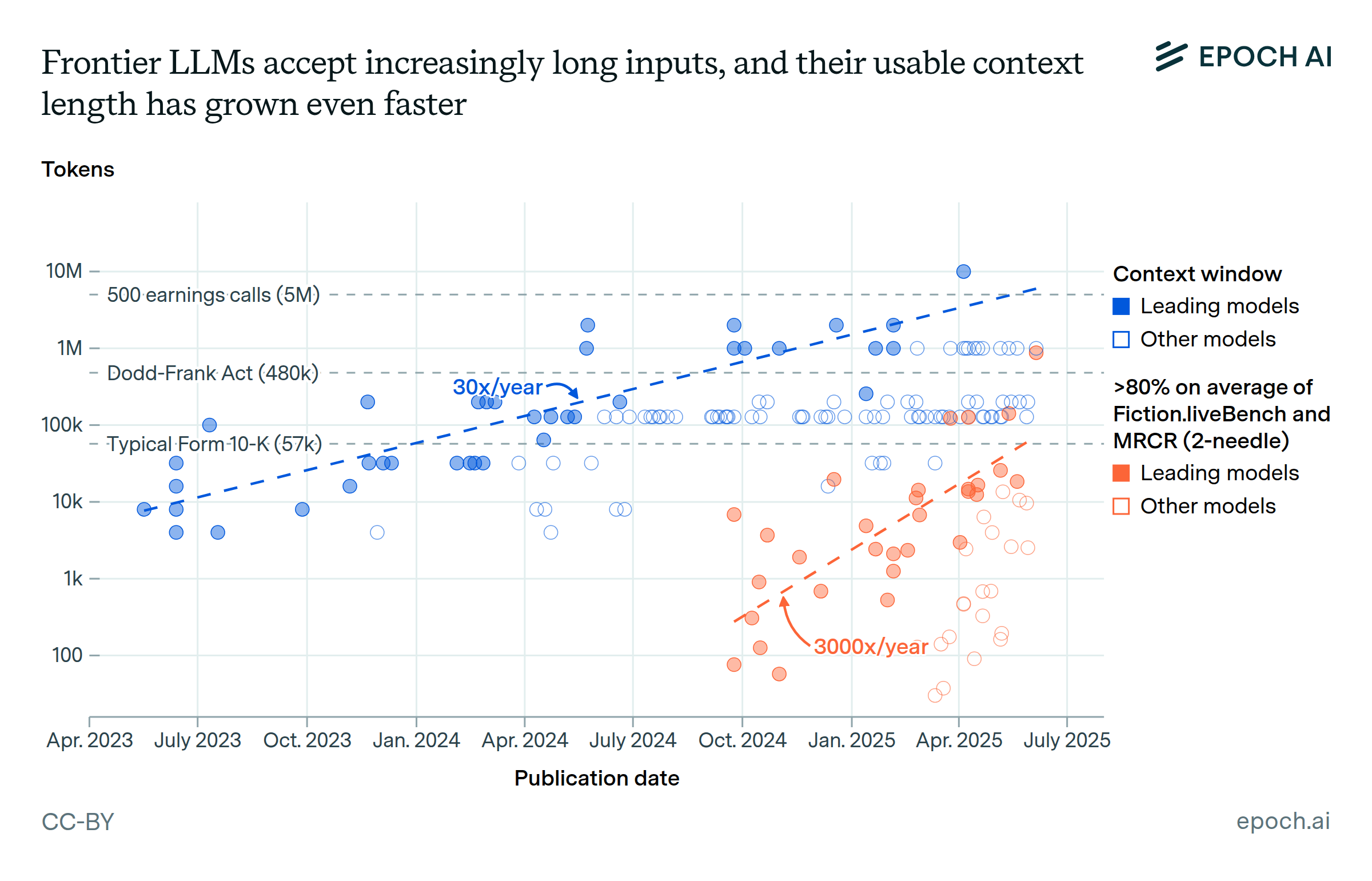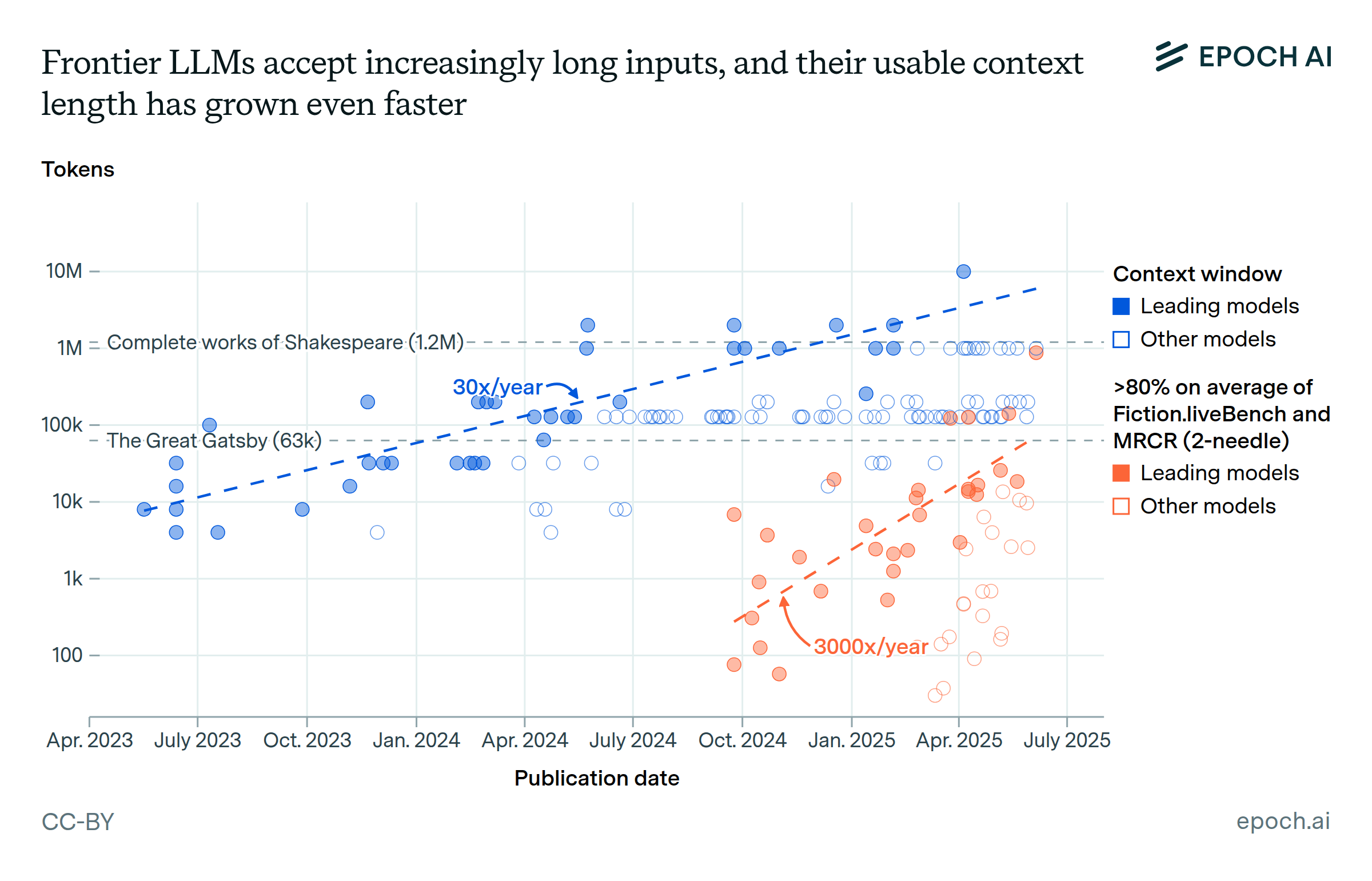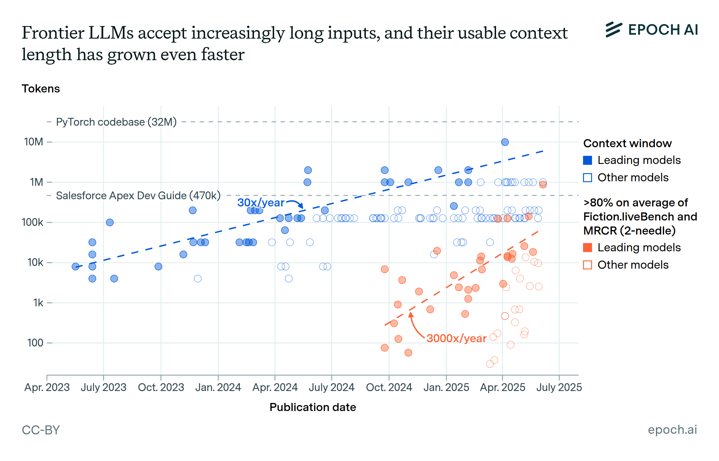 Today’s LLMs can only ingest a limited number of tokens per query, often called the context window. Since mid-2023, the longest LLM context windows have grown by about 30x per year. Their ability to use that input effectively is improving even faster: on two long-context benchmarks, the input length where top models reach 80% accuracy has risen by over 250x in the past 9 months.