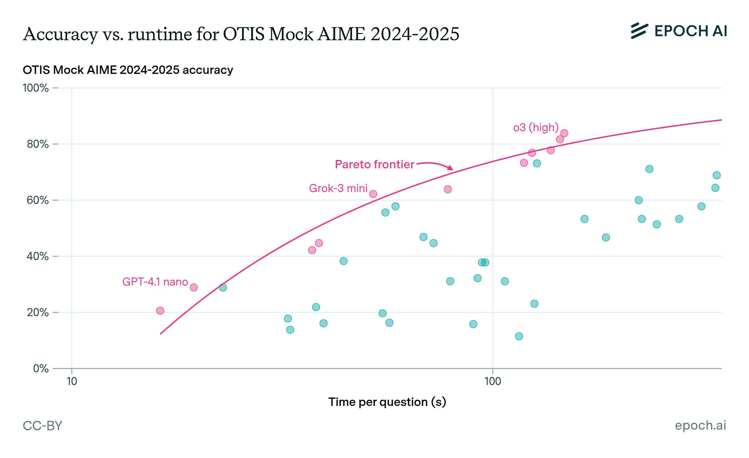 Data for runtime and accuracy comes from Epoch’s Benchmarking Hub. We focus on the benchmarks with highest coverage across models. These benchmarks all have a simple question-answering format which does not call for any agentic scaffolding or multi-turn interactions. Thus, runtime data reflects a single API call per sample. Models are typically sampled 8 times on GPQA Diamond and OTIS Mock AIME. Models are typically sampled 4 times on MATH Level 5, due to the larger size of this benchmark. In a few cases, due to cost or API instability, models are sampled only 1 time per question.