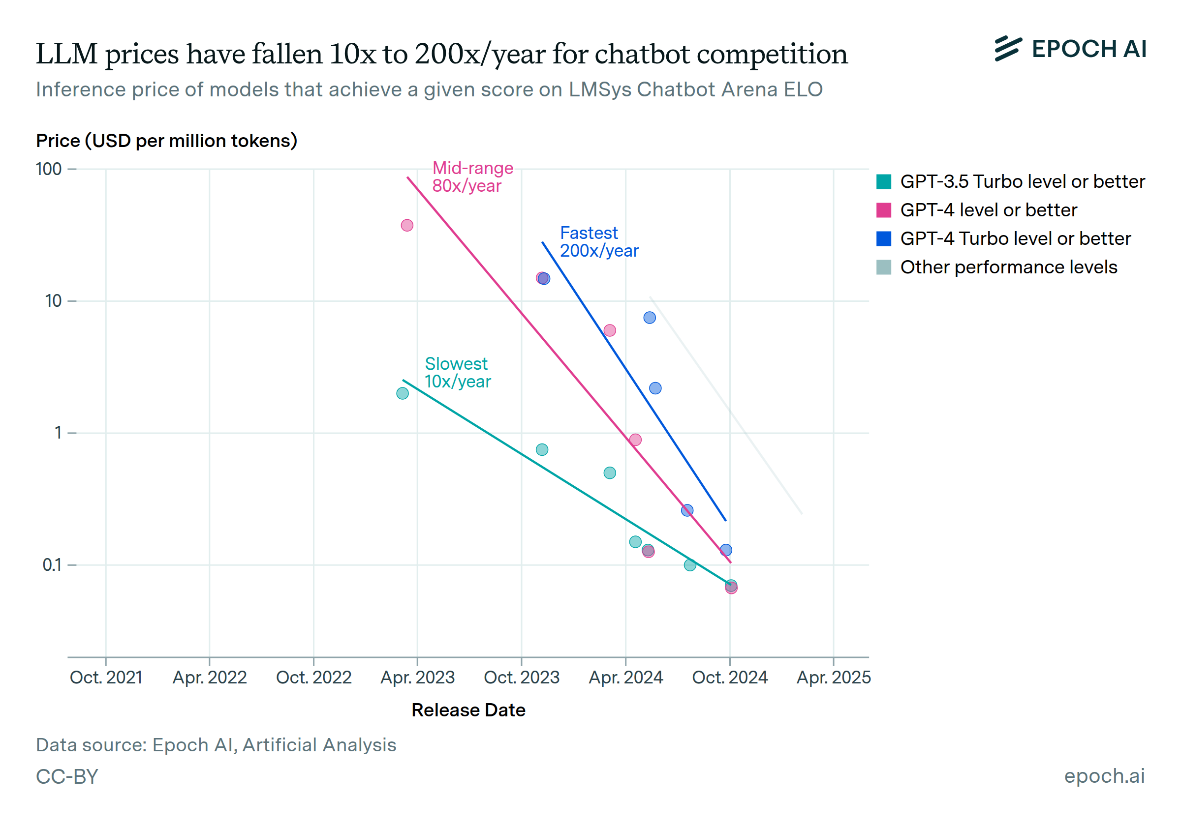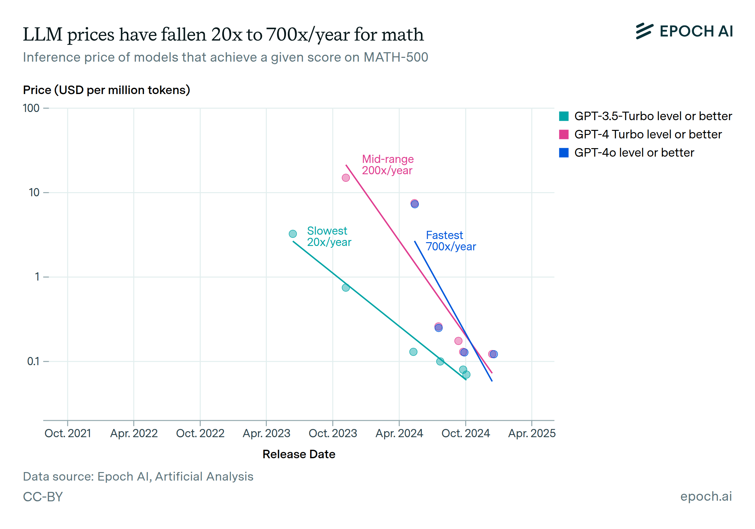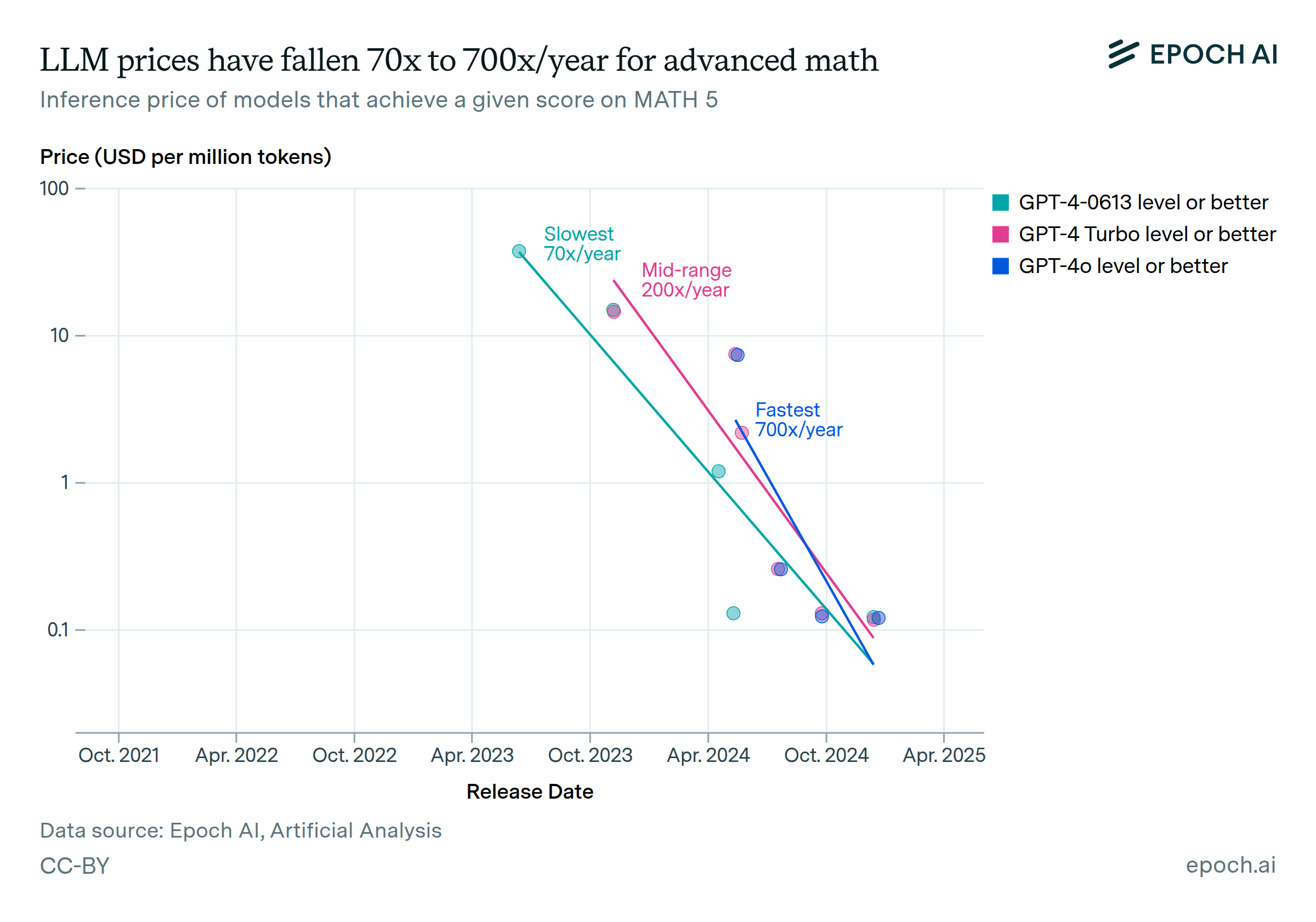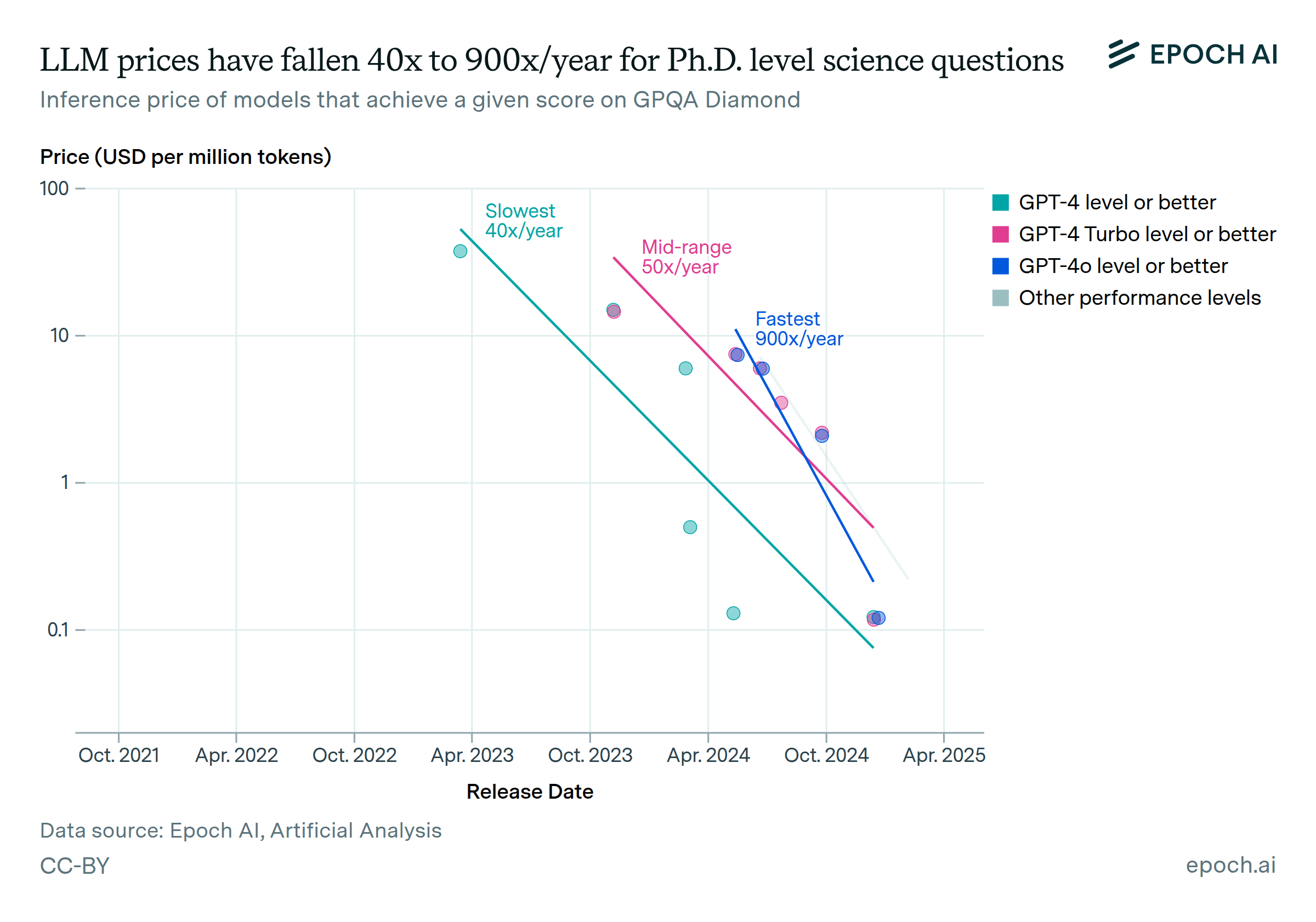 The inference price of LLMs has fallen dramatically in recent years. We looked at the results of state-of-the-art models on six benchmarks over the past three years, and then measured how quickly the price to achieve those milestones has fallen. For instance, the price to achieve GPT-4’s performance on a set of PhD-level science questions fell by 40x per year. The rate of decline varies dramatically depending on the performance milestone, ranging from 9x to 900x per year. The fastest price drops in that range have occurred in the past year, so it’s less clear that those will persist.