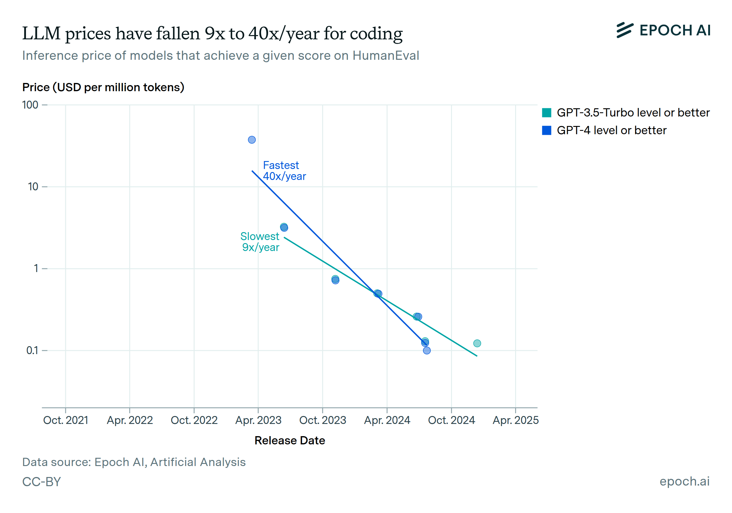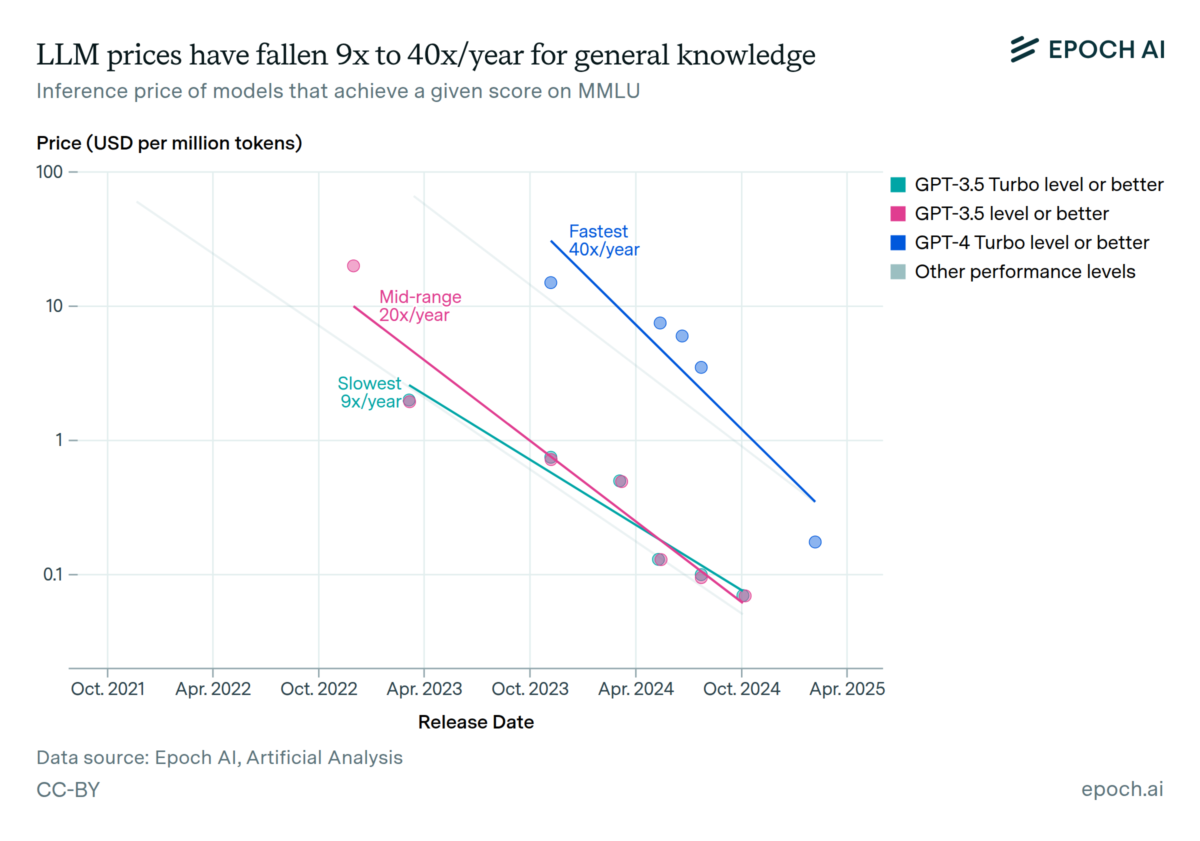 The dataset for this insight combines data on large language model (LLM) API prices and benchmark scores from Artificial Analysis and Epoch AI. We used this dataset to identify the lowest-priced LLMs that match or exceed a given score on a benchmark. We then fit a log-linear regression model to the prices of these LLMs over time, to measure the rate of decrease in price. We applied the same method to several benchmarks (e.g. MMLU, HumanEval) and performance thresholds (e.g. GPT-3.5 level, GPT-4o level) to determine the variation across performance metrics.