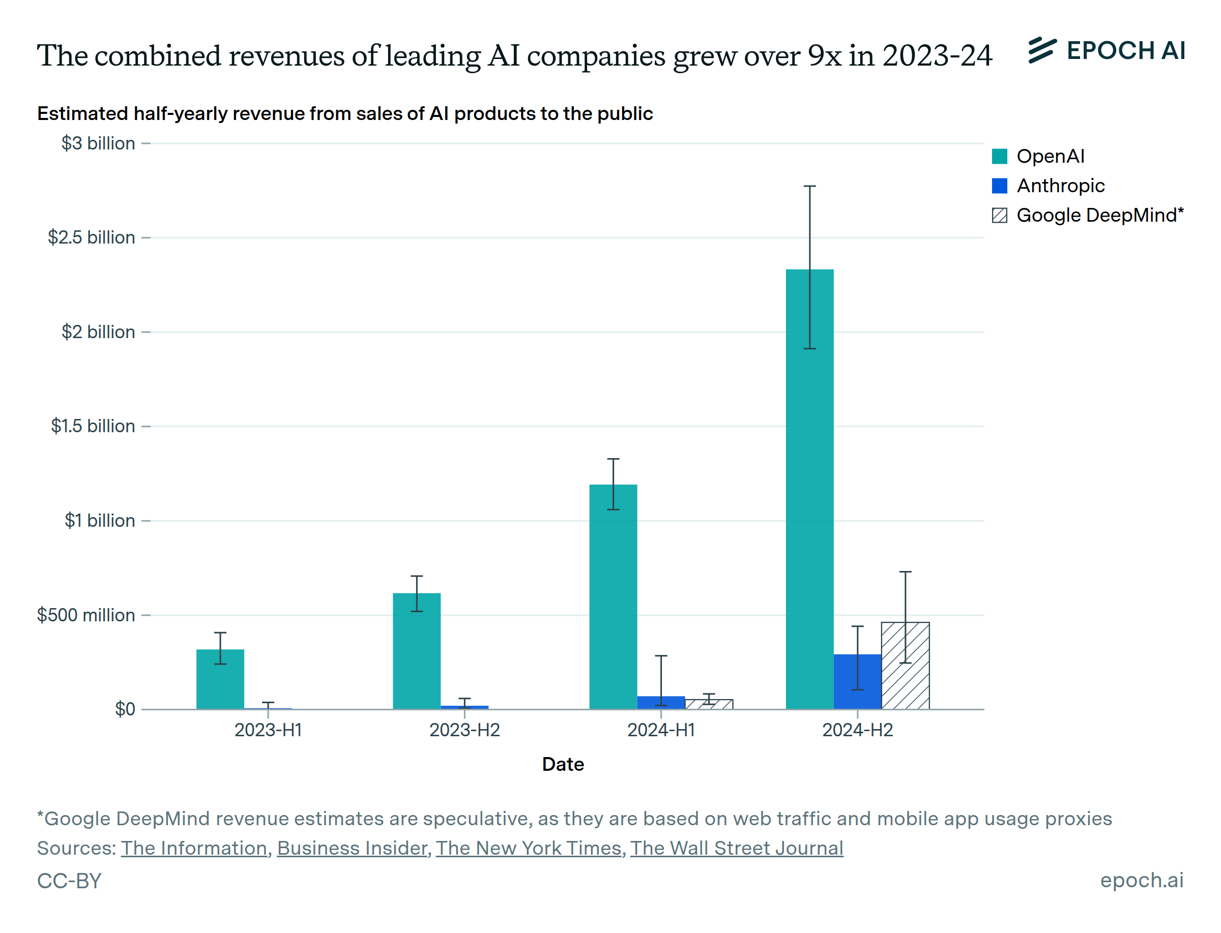 The combined revenues of leading AI companies grew by over 9x in 2023-2024