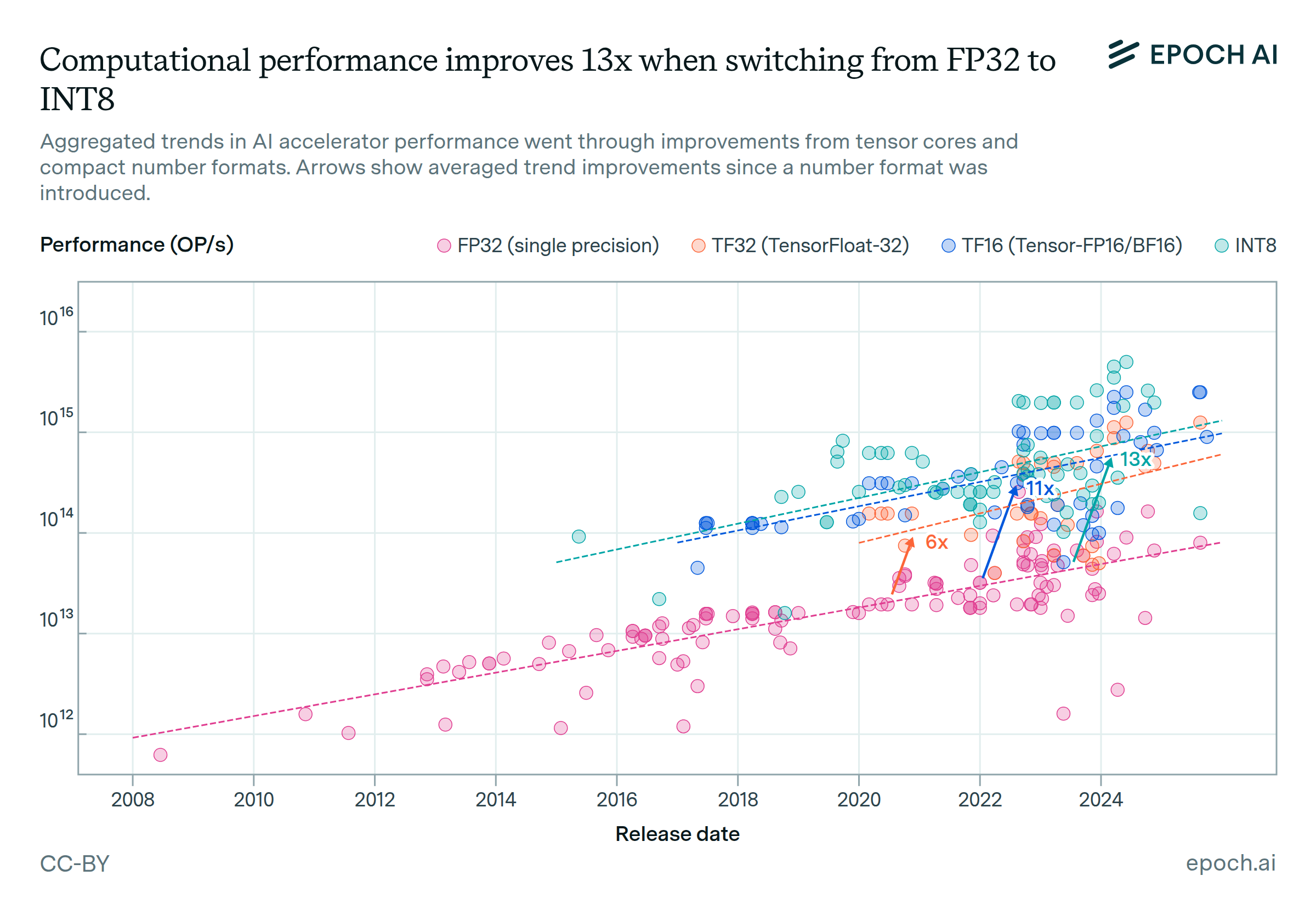 These improvements account for about half of the overall performance trend improvement since their introduction. Models trained with lower precision formats have become common, especially tensor-FP16, as developers take advantage of this boost in performance.