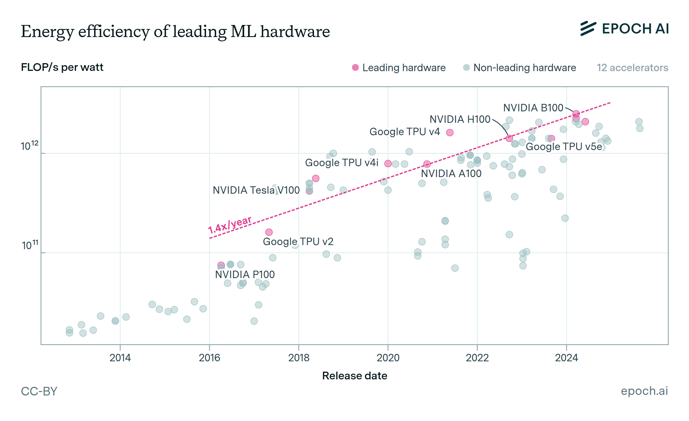 Historically, the energy efficiency of leading GPUs and TPUs has doubled every 2 years. In tensor-FP16 format, the most efficient accelerators are Meta’s MTIA, at up to 2.1 x 1012 FLOP/s per watt, and the NVIDIA H100, at up to 1.4 x 1012 FLOP/s per watt. The upcoming Blackwell series of processors may be even more efficient, depending on their power consumption.