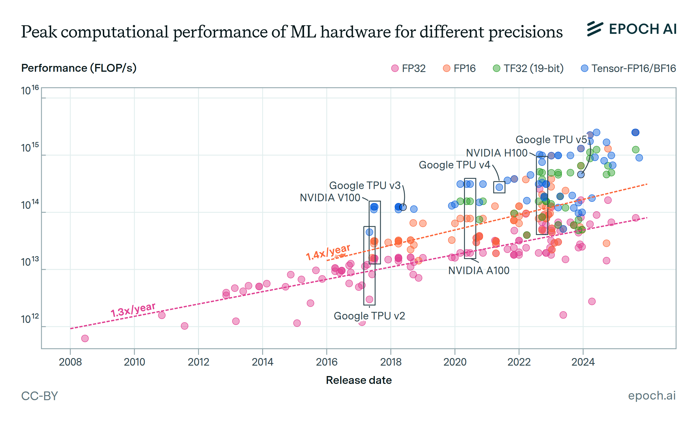 Measured in 16-bit floating point operations, ML hardware performance has increased at a rate of 36% per year, doubling every 2.3 years. A similar trend exists in 32-bit performance. Optimized ML number formats and tensor cores provided additional improvements.
