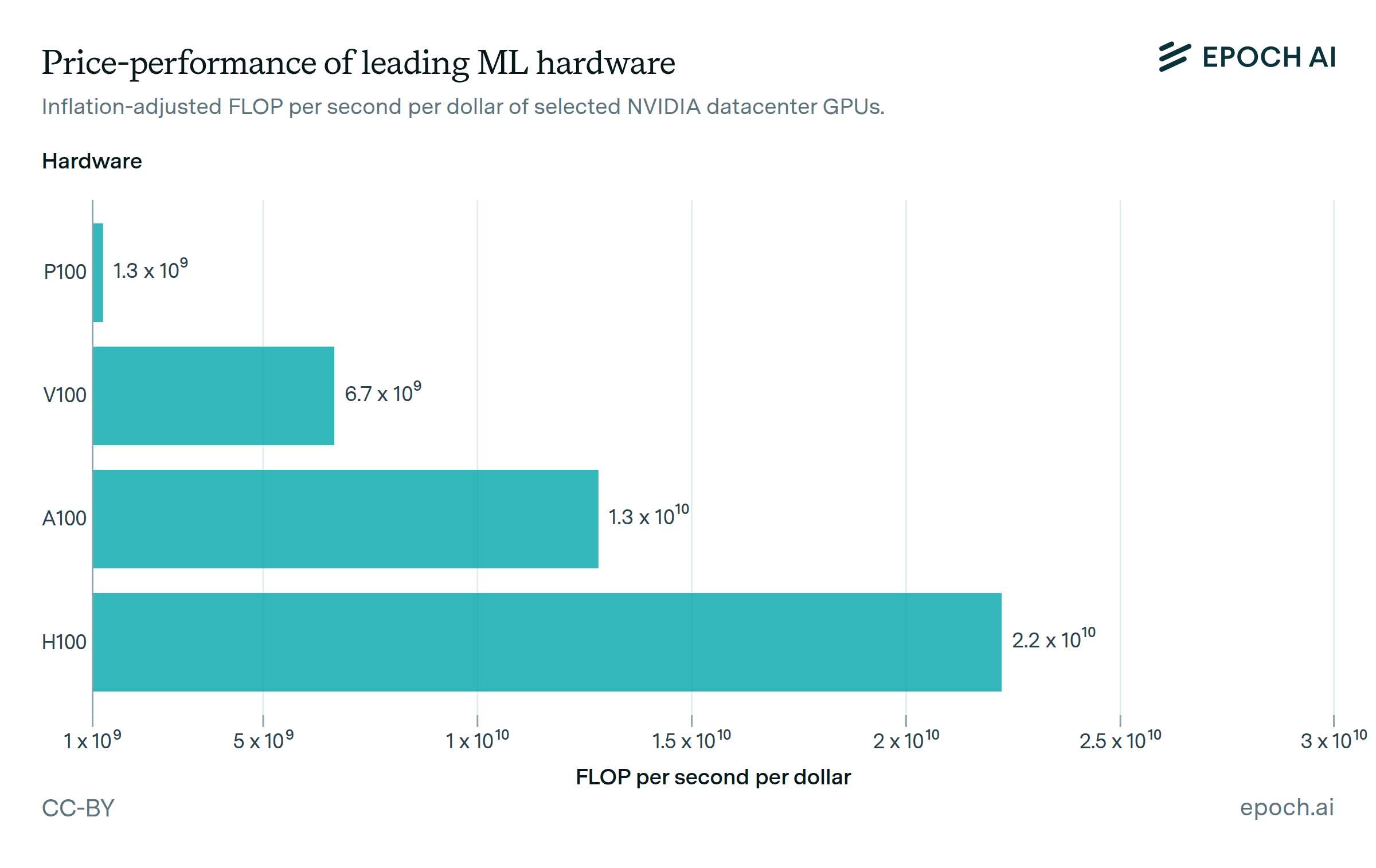 The improvement was driven by increasing transistor counts and other semiconductor manufacturing improvements, as well as specialized design for AI workloads. This improvement lowered cost per FLOP, increased energy efficiency, and enabled large-scale AI training.