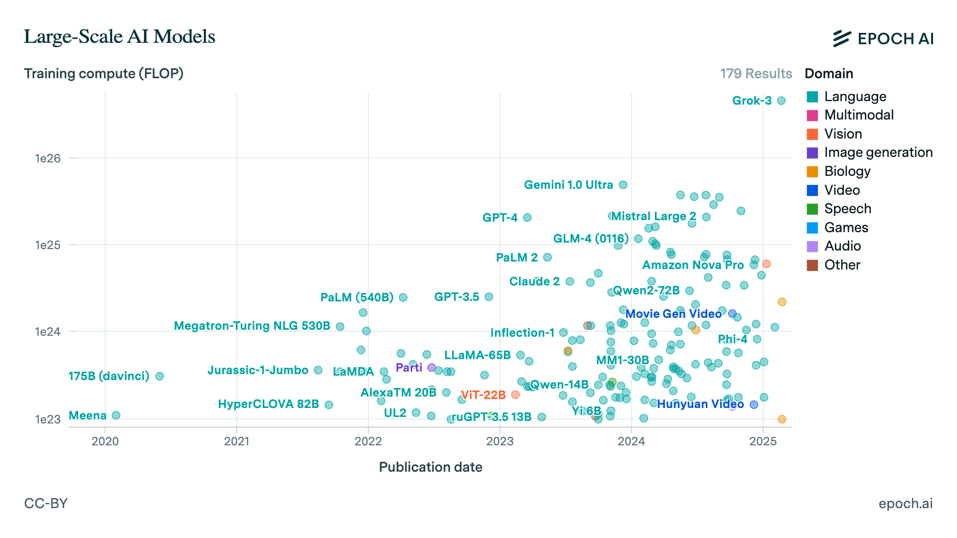 The release of GPT-4 in March 2023 stands out because GPT-4 represented a 10x compute scale-up over the models we had seen before. Since then, we’ve not seen another scale-up of this magnitude: all currently available frontier models, with the exception of Grok 3, have been trained on a compute budget similar to GPT-4 or less. For instance, Dario Amodei, CEO of Anthropic, recently confirmed that the training cost of Claude 3.5 Sonnet was in the tens of millions of dollars, and based on trends in GPU price-performance this means it was likely trained using around twice the compute that GPT-4 used.