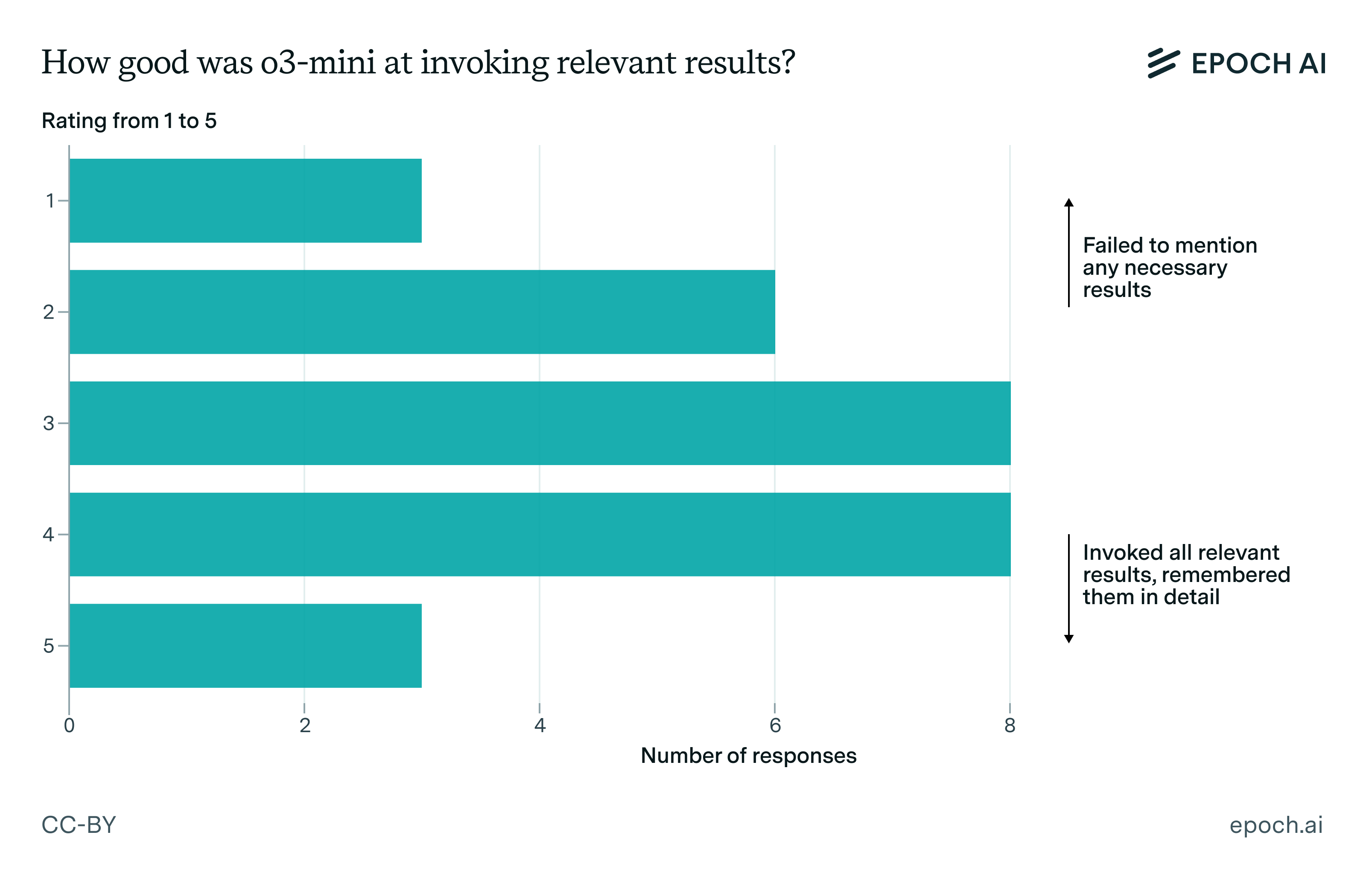 Figure 1: The reviewing mathematicians generally found that o3-mini-high was decent at invoking relevant results from the mathematical literature, achieving a rating of 3/5 or higher on around two thirds of problems.
