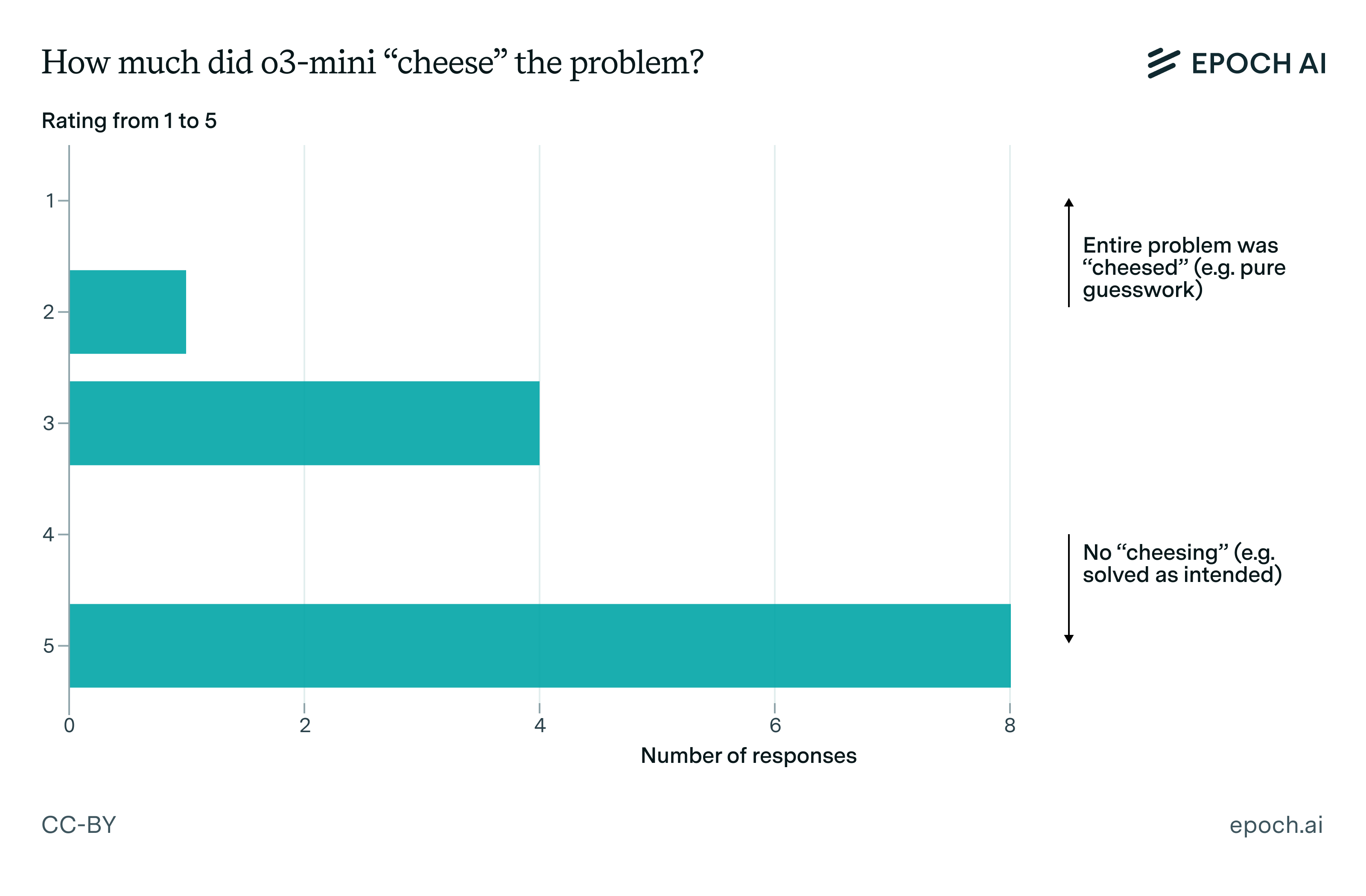 Figure 2: “Cheesing” the problem (not solving the problem as intended) was fairly common, but more often than not o3-mini-high correctly solved the problem without any cheesing at all (i.e. a score of 5). Note that this graph only pertains to reasoning traces where o3-mini-high correctly answered the problem in question.