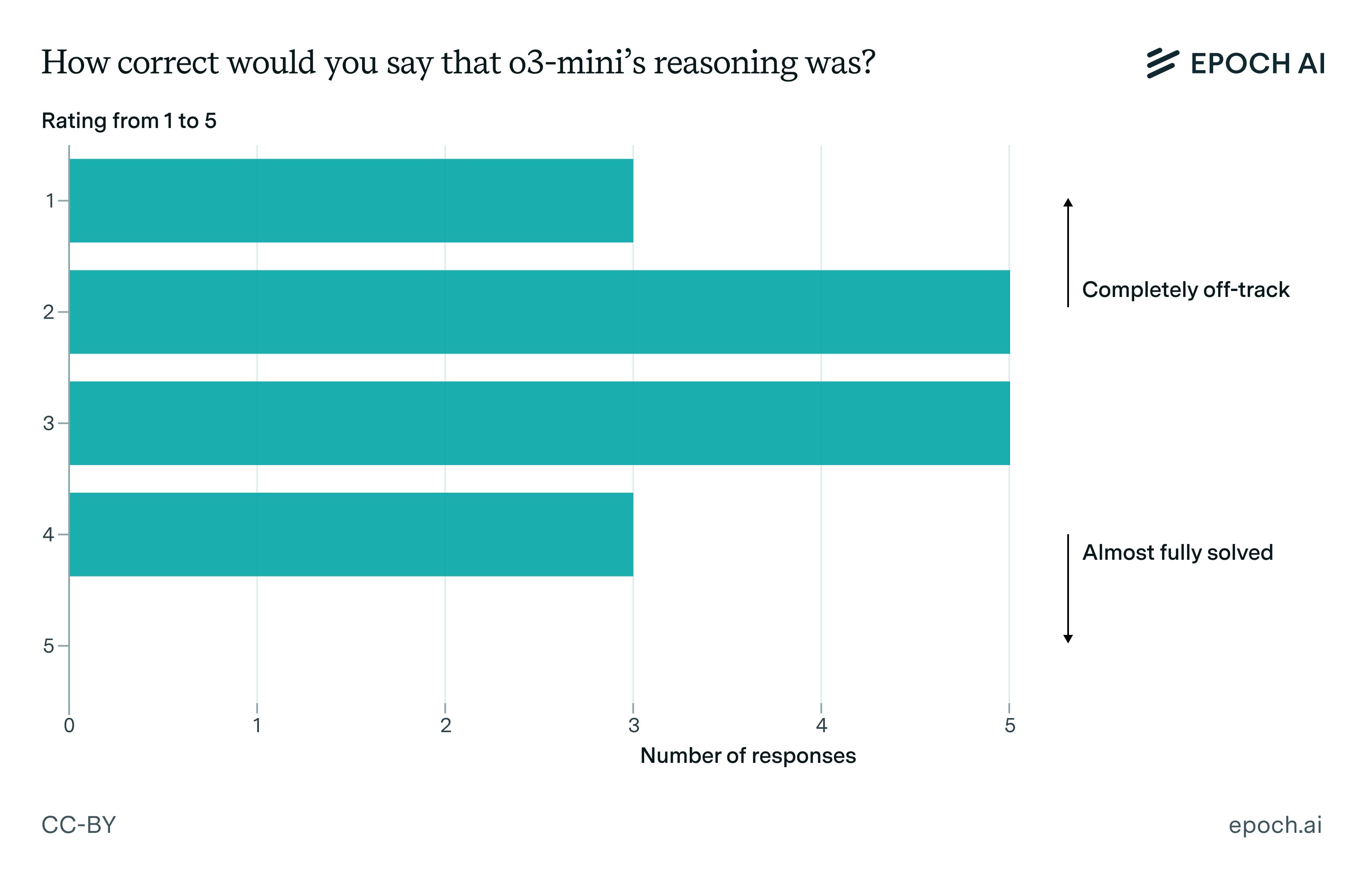 To answer these questions, we asked fourteen mathematicians to analyze 29 of o3-mini-high’s raw, unsummarized reasoning traces on FrontierMath problems, which OpenAI shared with us.1 Our goal in this post is to share the main takeaways from this survey, and discuss what this means for future developments at the intersection of AI and math.