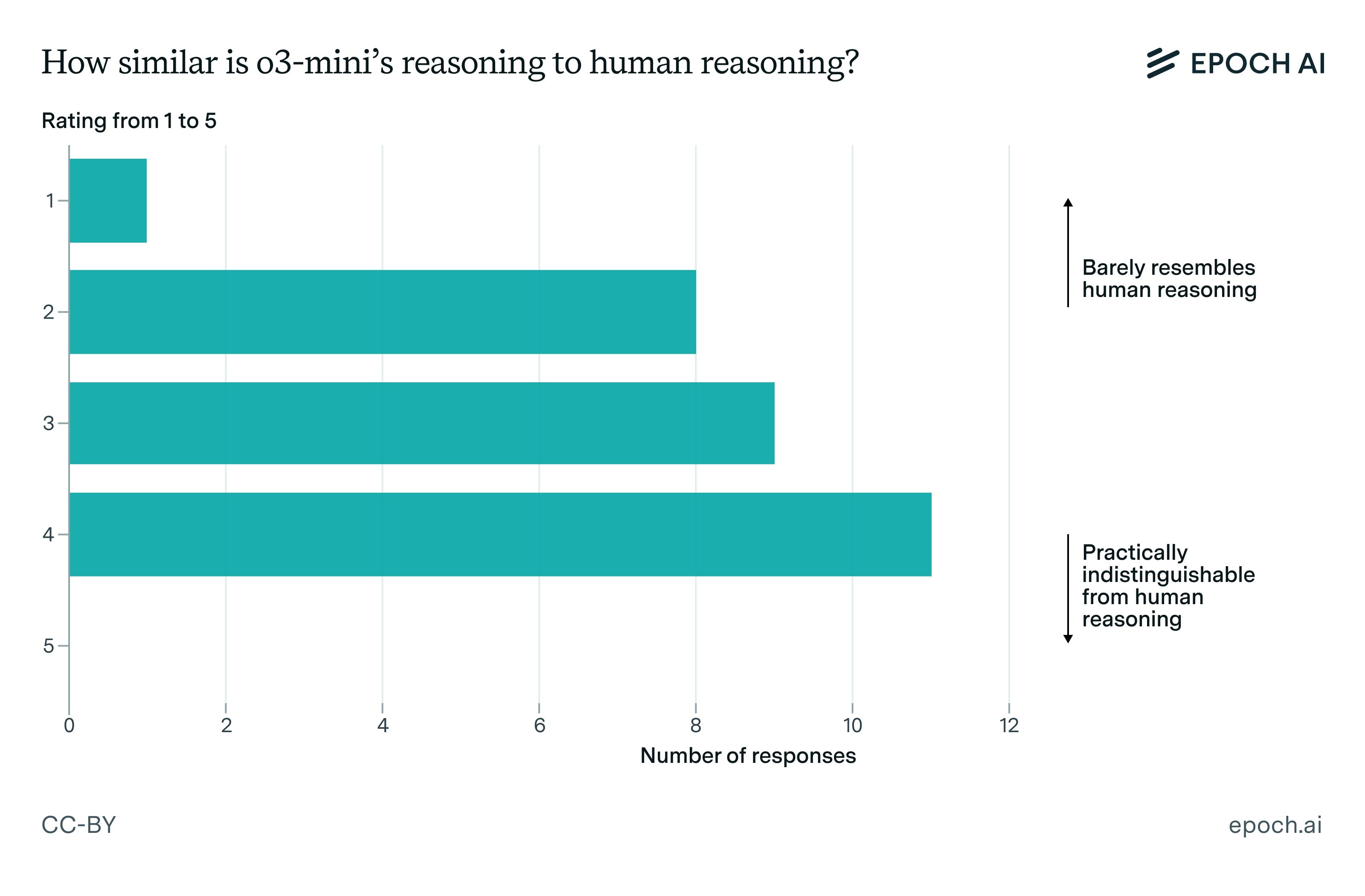 Figure 4: Mathematician ratings of how human-like o3-mini-high reasoning is. A score of 1 corresponds to reasoning that is not human-like at all, and a score of 5 corresponds to reasoning that is indistinguishable from a human mathematician.