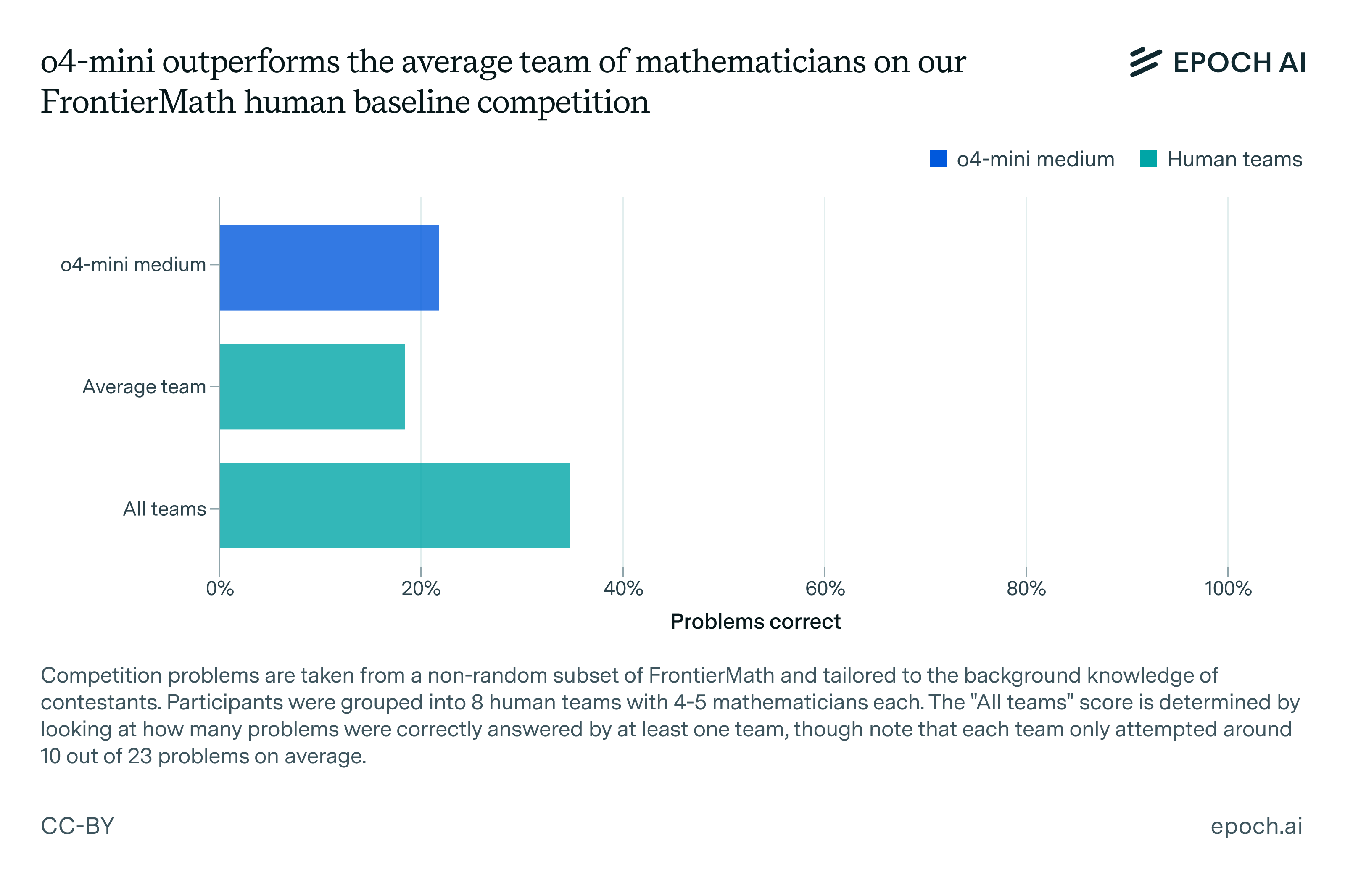 Figure 1: o4-mini-medium scored 22% on the FrontierMath human baseline competition, outperforming the average team (19%) but falling short of the combined score across all teams (35%). Note that o4-mini-medium only managed to solve problems that at least one human team had solved. Competition results can be found in this spreadsheet.