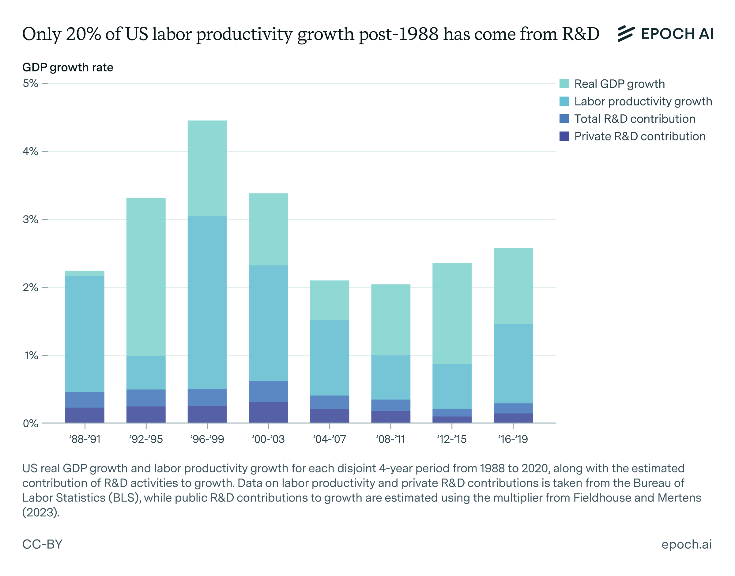 To understand our argument disputing the second claim, we must first measure the actual economic value of R&D. We know that R&D gets its economic value primarily through improving productivity, so to quantify the impact of R&D we might ask how much of the growth in labor productivity in the past has been due to R&D spending and its associated spillovers. The US Bureau of Labor Statistics estimates that R&D financed by private firms only accounted for around 0.2%/yr of total factor productivity (TFP) growth in the US from 1988 to 2022, compared to around 0.8%/yr of total TFP growth over the same period and around 1.9%/yr of labor productivity growth.