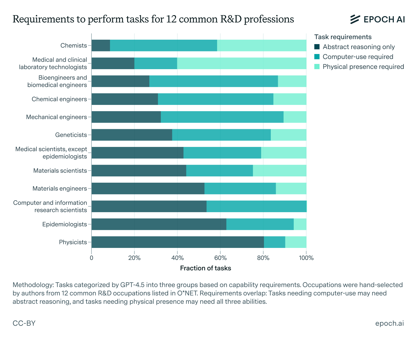 This pattern holds true across other common research occupations too. To demonstrate this, we used GPT-4.5 to label tasks across 12 common R&D occupations into one of three categories, depending on whether it thinks the task can be performed using only abstract reasoning skills, whether it requires complex computer-use skills (but not physical presence), or whether it one needs to be physically present to complete the task. See this link to our conversation with GPT-4.5 to find our methodology and results.