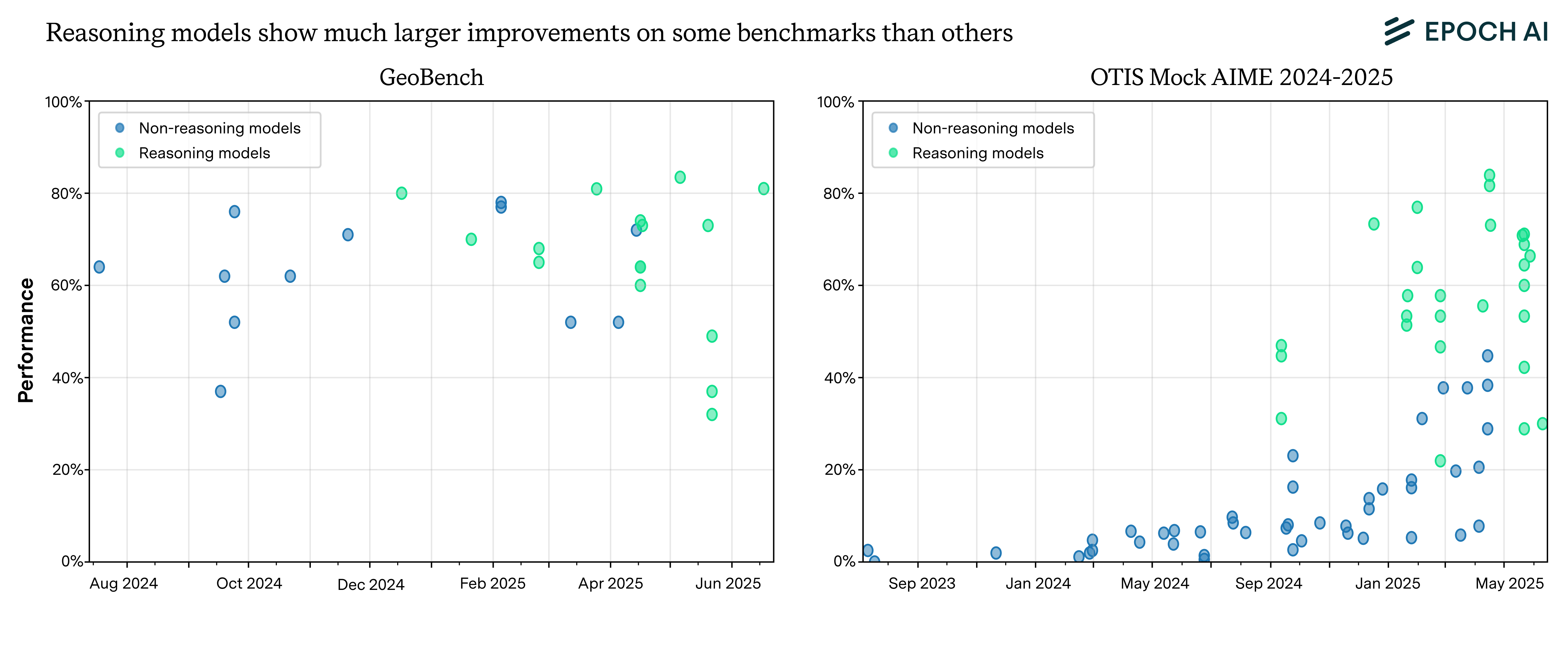 Reasoning models seem to show little improvement on GeoBench, but substantially exceed the non-reasoning model trend on OTIS Mock AIME 2024-2025.