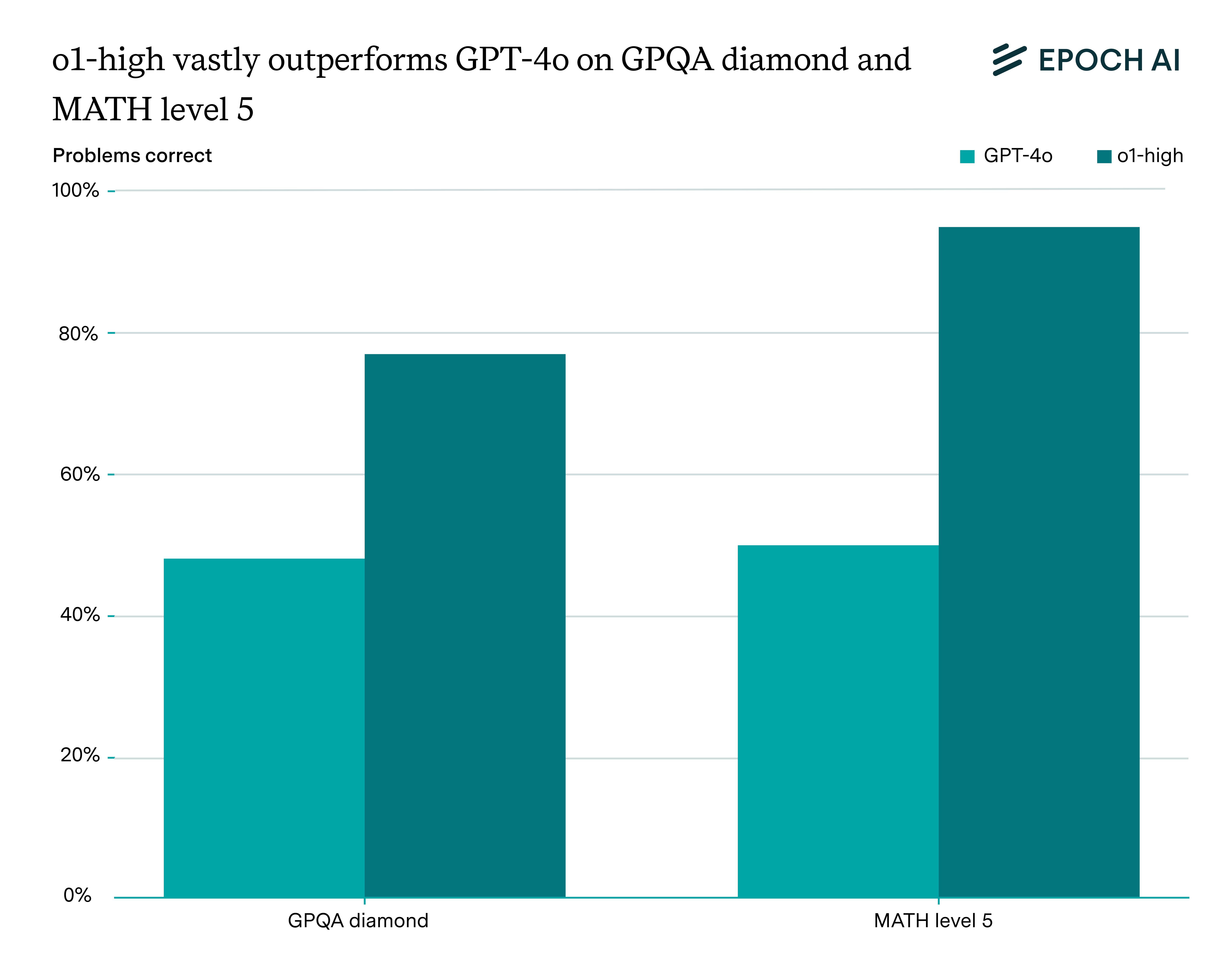 o1 performs far better than GPT-4o on GPQA diamond (PhD-level multiple-choice science questions) and MATH level 5 (high-school math competition problems).1 Data is taken from Epoch AI’s benchmarking hub.